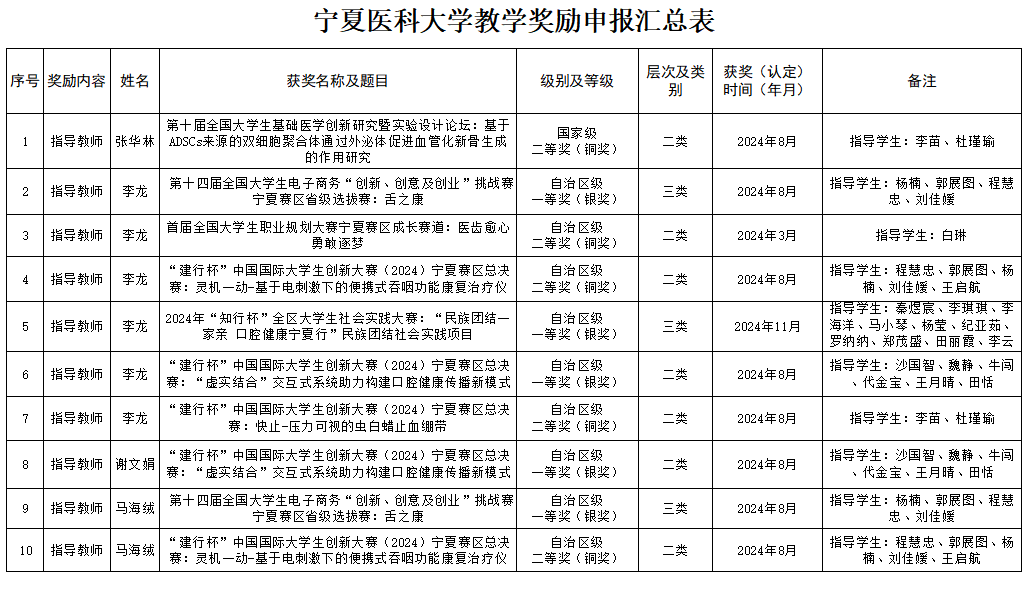 根据澳门十大信誉好的网站《关于印发<澳门十大信誉好的网站教育教学奖励实施办法>的通知(宁医校发〔2024〕101号)》要求,经个人申报、学院审核,现将2024年度澳门十大信誉好的网站口腔医学院教育教学奖励申报结果公示如下: