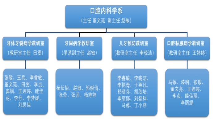 口腔内科教研室成立于2005年5月,2008年更名为口腔内科学系。2018年口腔内科学系下设牙体牙髓病学教研室、牙周病学教研室、儿牙预防教研室、口腔黏膜病学教研室。学系现有副主任1名,教研室主任4名;专/兼职教师26名。职称结构为:教授4名(返聘3名),副教授3名,讲师13名,助教6名,其中博士2名,硕士21名,大学本科3名。承担口腔医学硕士研究生、五年制口腔医学本科生、三年制口腔高职生、留学生、进修生、规培生等多层次的《牙体牙髓病学》、《牙周病学》、《儿童口腔医学》、《预防口腔医学》、《口腔黏膜病学》、《口腔内科学》(口腔高职)、《口腔医学导论》、《口腔临床技能实践》、《口腔专业英语》、《口腔科学》(留学生)等课程的教学任务。其中《牙体牙髓病学》、《牙周病学》、《儿童口腔医学》、《预防口腔医学》、《口腔黏膜病学》为我系的核心课程。