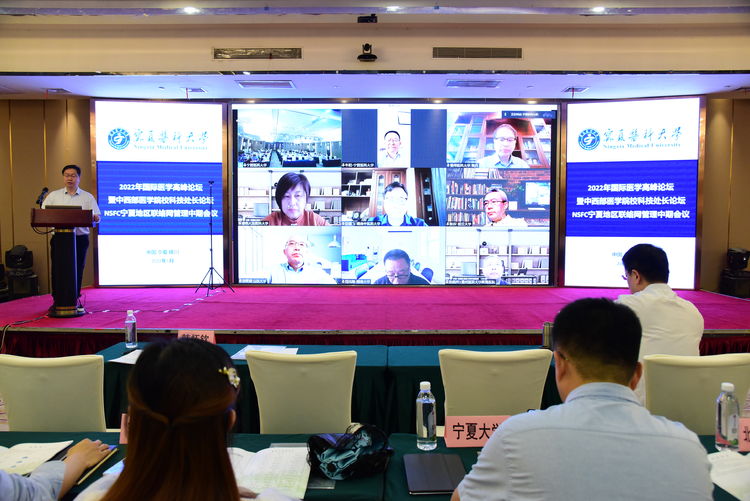 5月28日,2022年国际医学高峰论坛暨中西部医学院校科技处长论坛、NSFC宁夏地区联络网管理工作中期会议在银川金宇伊豪宾馆宴会厅顺利召开。本次会议邀请北京中医药大学、复旦大学、南方医科大学、山东大学等11所高校科研处长线上线下参加交流研讨。来自宁夏大学、北方民族大学、宁夏师范学院等全区26家依托单位的科研管理负责人、学校各科研单位科管人员等120余人参加了会议。学校党委副书记牛阳通过线上参加会议,会议由学校科技处韩怀钦处长主持。