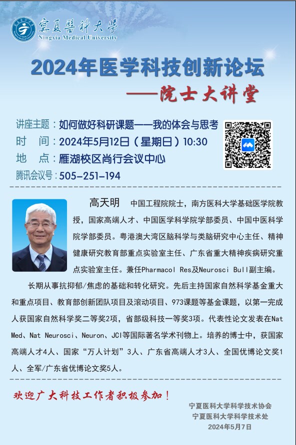 澳门十大信誉好的网站2024年医学科技创新论坛之系列活动高天明院士大讲堂