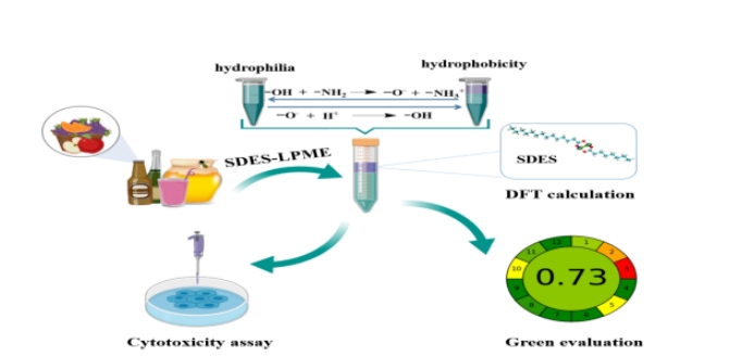该研究中,制备了一种基于脂肪酸和聚醚胺离子对的SDES,用于饮用水、饮料和蜂蜜中苯氧乙酸类除草剂的液相微萃取(LPME)。合成的SDES具有可逆的极性切换特性,可同时实现均相萃取和快速两相分离,极大地简化了预处理过程,缩短了萃取时间(4 min),并且在整个萃取过程未使用任何传统有机溶剂,绿色环保。采用Box-Behnken设计对影响萃取效率的关键参数进行研究,在最佳条件下,该方法检测限低(3 ~ 5 μg L-1),精密度良好(RSD < 8.1%),回收率较高(72.6 ~ 98.7%)。利用FT-IR和1H NMR解释了SDES的极性切换机理,并应用密度泛函理论探究了SDES的形成机制。采用生态分析模型、绿色指标分析方法和绿色分析程序对该方法进行评价。此外,本文还对SDES的细胞毒性进行了研究,结果显示EC50 > 500 mg L-1,表明所制备的SDES具有良好的生物相容性。因此,该方法灵敏、高效且绿色环保,在复杂基质中痕量组分的富集分析中展示出良好的应用前景。