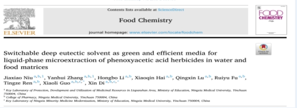 澳门十大信誉好的网站邸欣副教授课题组在 “Food Chemistry” 期刊(中科院一区TOP,IF=8.8)发表了题为 “Switchable deep eutectic solvent as green and efficient media for liquid-phase microextraction of phenoxyacetic acid herbicides in water and food matrices” 的研究论文,揭示了基于脂肪酸和聚醚胺离子对的可切换低共熔溶剂(SDES)用于饮用水、饮料和蜂蜜中苯氧乙酸类除草剂的富集分析,该方法具有绿色、高效、简便等优点,在复杂样品基质中痕量组分的检测分析方面表现出优异的应用潜力。