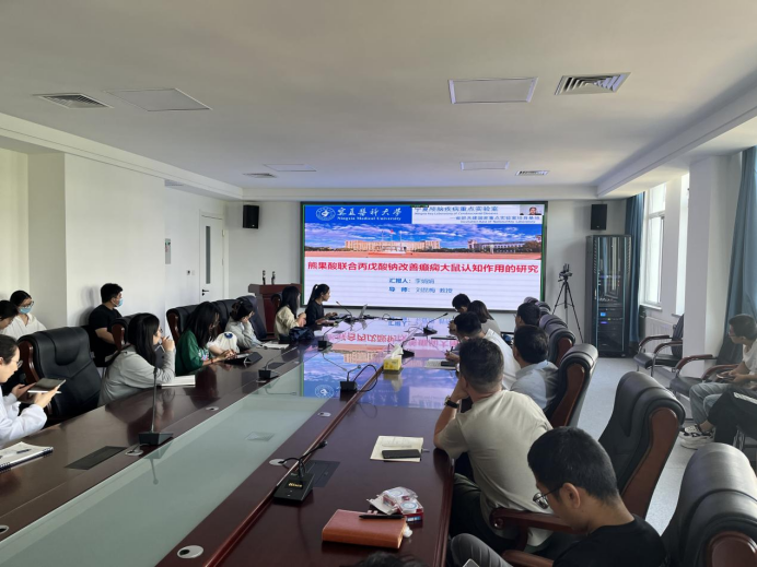 刘昆梅教授以“AEG-1在癫痫与认知中的作用研究”为题,从AEG-1功能、AEG-1敲除鼠的构建、相关形态学和电生理学的角度,展示了近期研究成果和相关内容;医学神经生物学2021级硕士研究生李娟娟做了“熊果酸联合丙戊酸钠改善癫痫大鼠认知作用的研究”的研究汇报,分享了其实验期间的研究内容和所取得的数据结果。