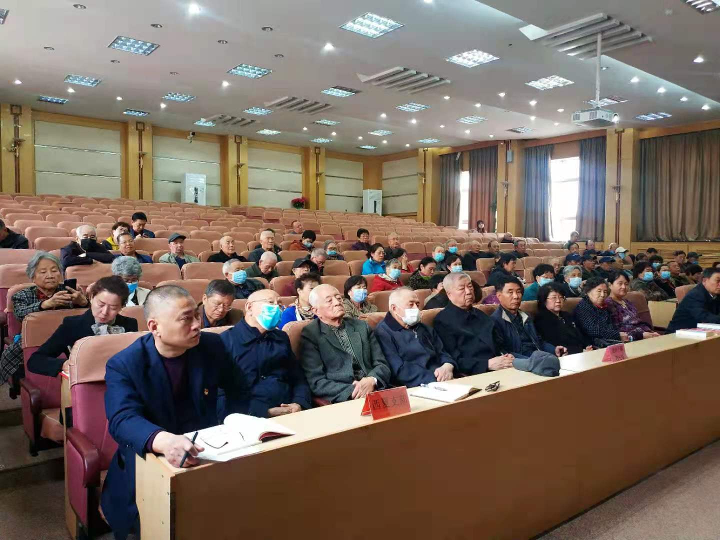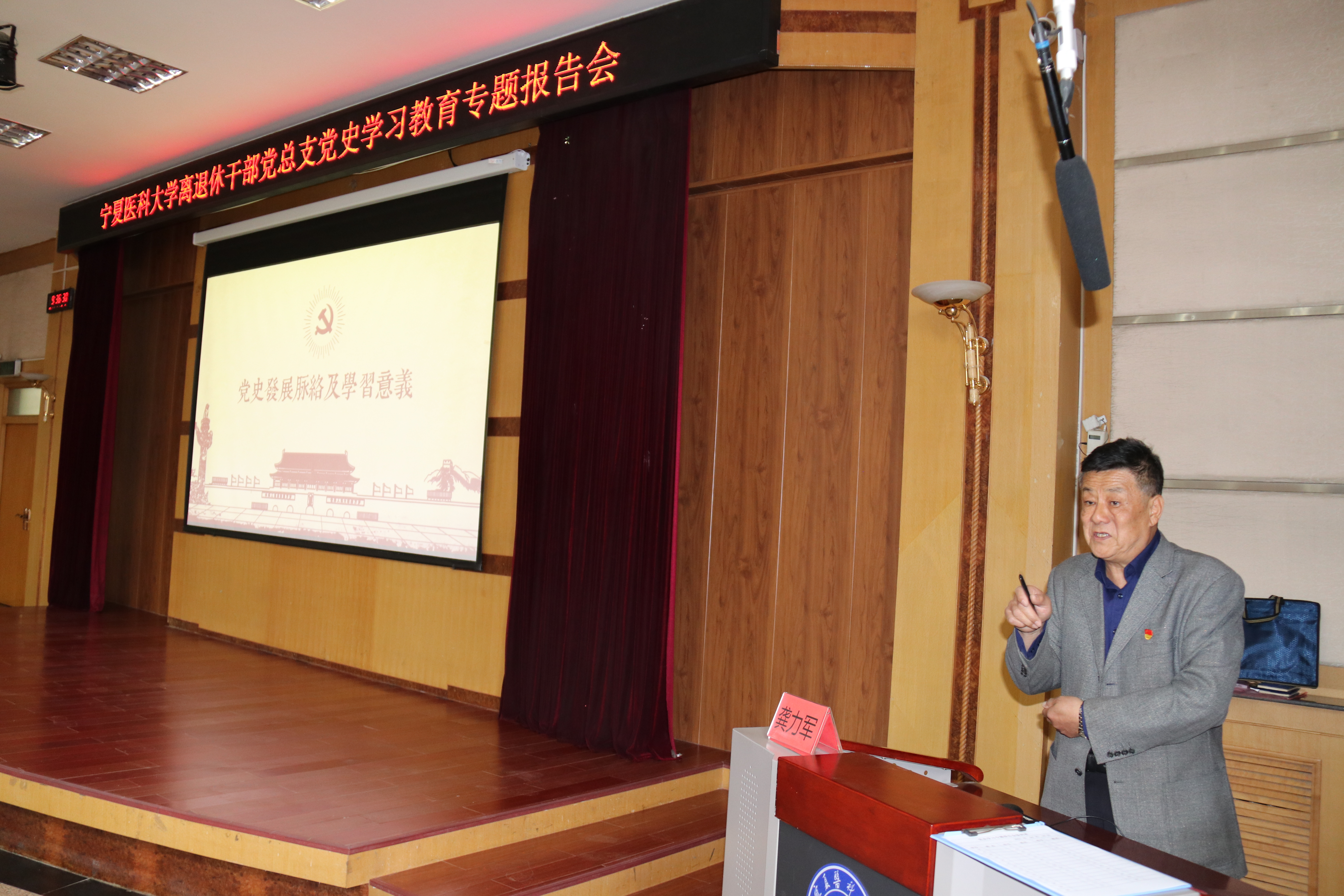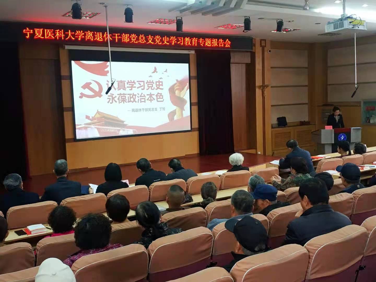 4月9日上午,离退休干部党总支在双怡校区多功能厅举办离退休干部党史学习教育专题报告会。党总支副书记黄义主持会议。离退休干部党员、宁夏老年大学医科大学分校“趣缘型”党支部部分党员共90余名参加。
