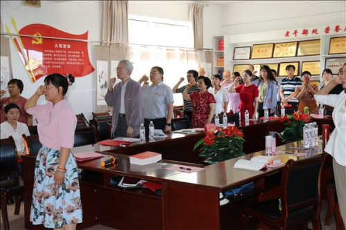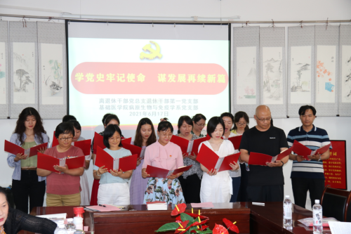 6月17日下午,基础医学院病原生物学与免疫学党支部和退休干部第一党支部在双怡校区老年活动中心联合开展“学党史牢记使命 谋发展再续新篇”主题党日活动,学校党史学习教育第三巡回指导组组长、学校纪委书记、监察专员谢波同志与基础医学院病原生物学与免疫学党支部党员、部分教师和学生代表,离退休干部各党支部书记、退休干部第一党支部党员共50余人参加活动。