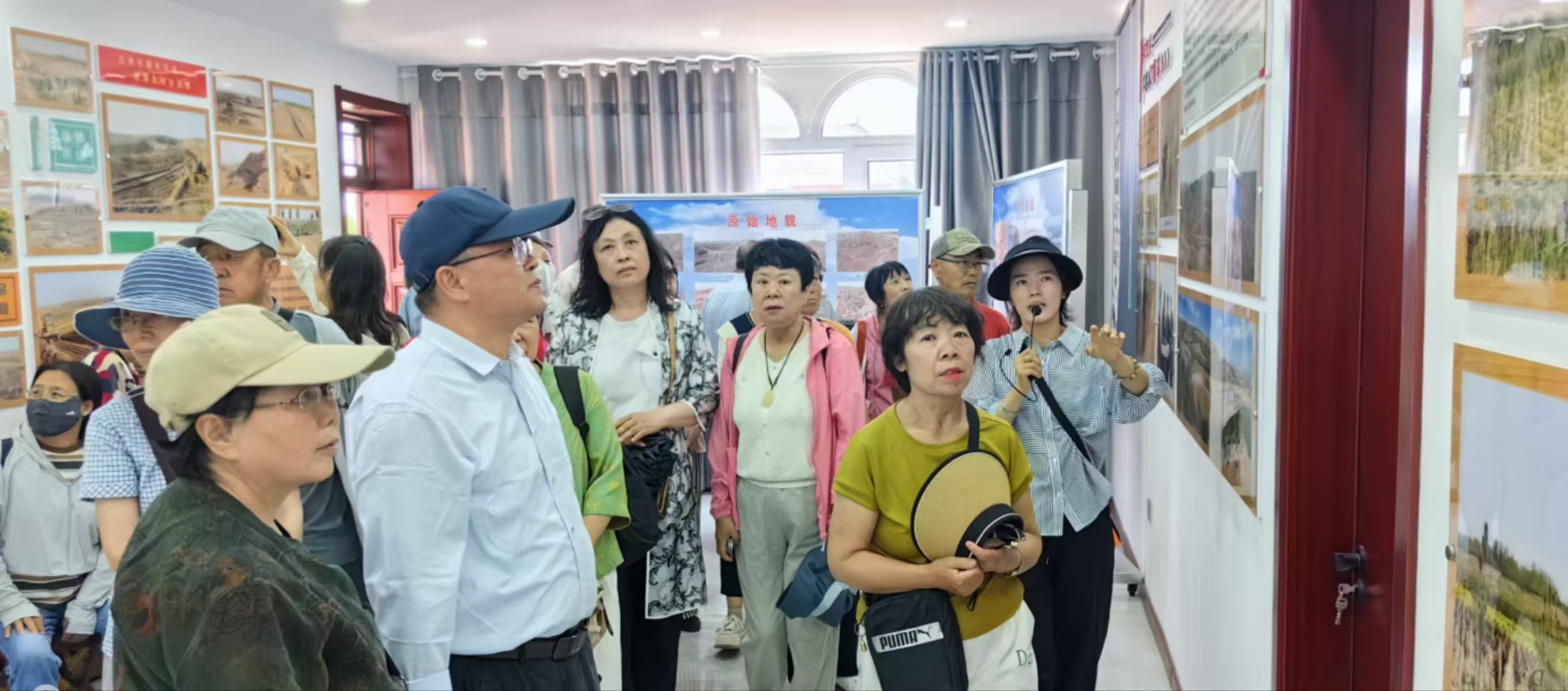 清晨迎着朝阳,老同志乘车前往白芨滩防风固沙林场,讲解员向老同志们详细介绍了保护区几十年来防沙治沙的艰辛历程和显著成效。从早期的艰苦探索到如今的科学治理,从传统的治沙方法到先进的精准治沙技术,每一个阶段都展现出治沙人的智慧和勇气。站在治理区的高处俯瞰,昔日黄沙肆虐的沙地,如今已绿意盎然,代代治沙英雄的“薪火相传”,创造了人进沙退的奇迹。治沙人用坚韧顽强的毅力和无私奉献的精神,在沙漠中书写了绿色的传奇。他们认真聆听每一个治沙故事,驻足观看一幅幅记录治沙历史的图片、一段段展现生态变迁的影像,老同志们被治沙英雄们的感人事迹深深打动。