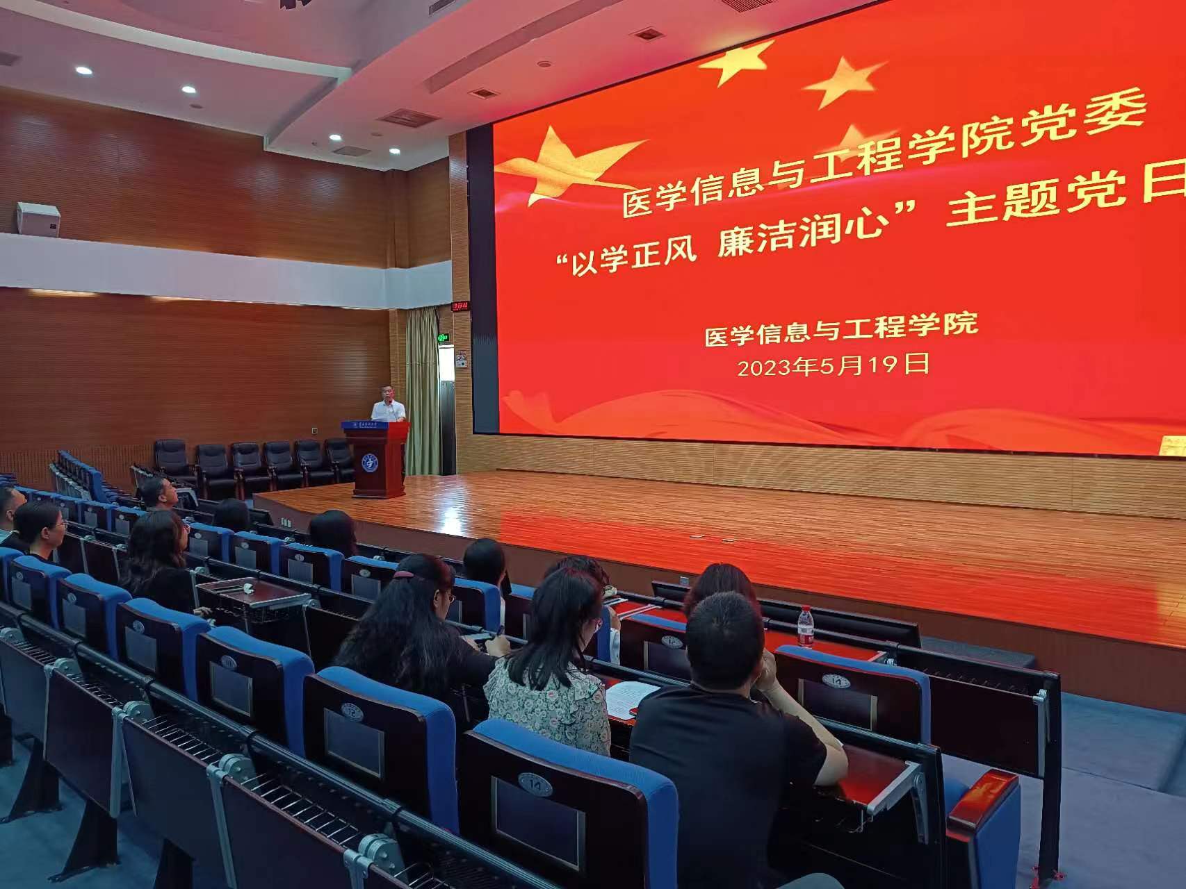 5月19日,医学信息与工程学院在尚行会议中心开展“以学正风 廉洁润心”主题党日活动。活动由学院党委委员、副院长任海涛主持,全体教师党员和学生党员代表参加。