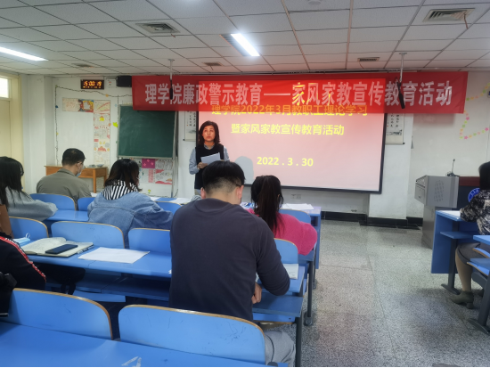 为落实《澳门十大信誉好的网站2022年“廉政警示教育周”活动方案》要求,巩固和拓展党史学习教育成果,督促党员干部、教职工、学生加强自我监督约束,净化“八小时”之外的生活圈、交往圈,提高家风家教意识,以良好的家风带动工作作风,理学院3月30日14:00组织全体教职工和学生党员开展了家风家教宣传教育活动。活动由学院副院长、纪检委员宋斐主持。