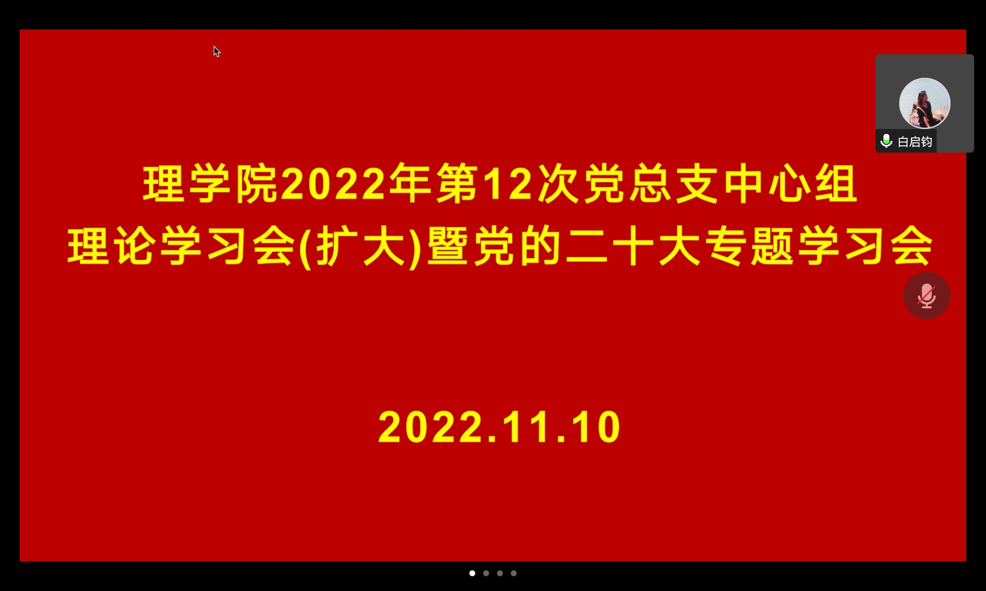 11月10日,理学院党总支通过腾讯会议线上召开了理学院2022年第十二次党总支中心组理论学习会暨党的二十大精神专题(扩大)学习会。学院领导、中心组成员及全体党员参会,会议由学院党总支书记白启钧主持。