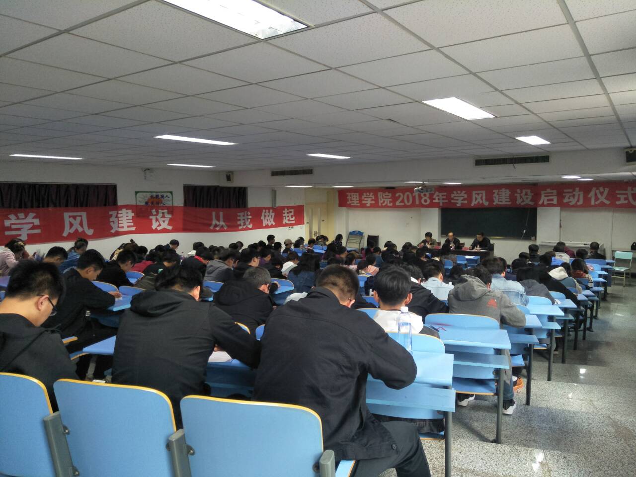 3月21日16:00,理学院在厚生楼201教室举行“理学院2018年学风建设启动仪式暨审核评估工作动员大会”。学院领导、全教职工、全体学生参加了本次动员大会。