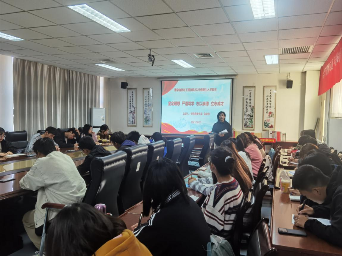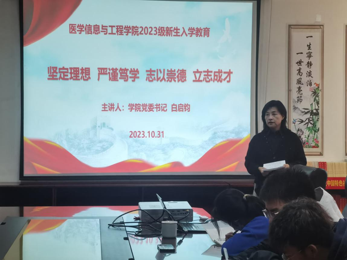 10月31日,学院党委书记白启钧在雁湖校区厚生楼428会议室以“坚定理想 严谨笃学 志以崇德 立志成才”为主题,为学院2023级医学信息工程班全体同学讲授了一场生动的入学教育。