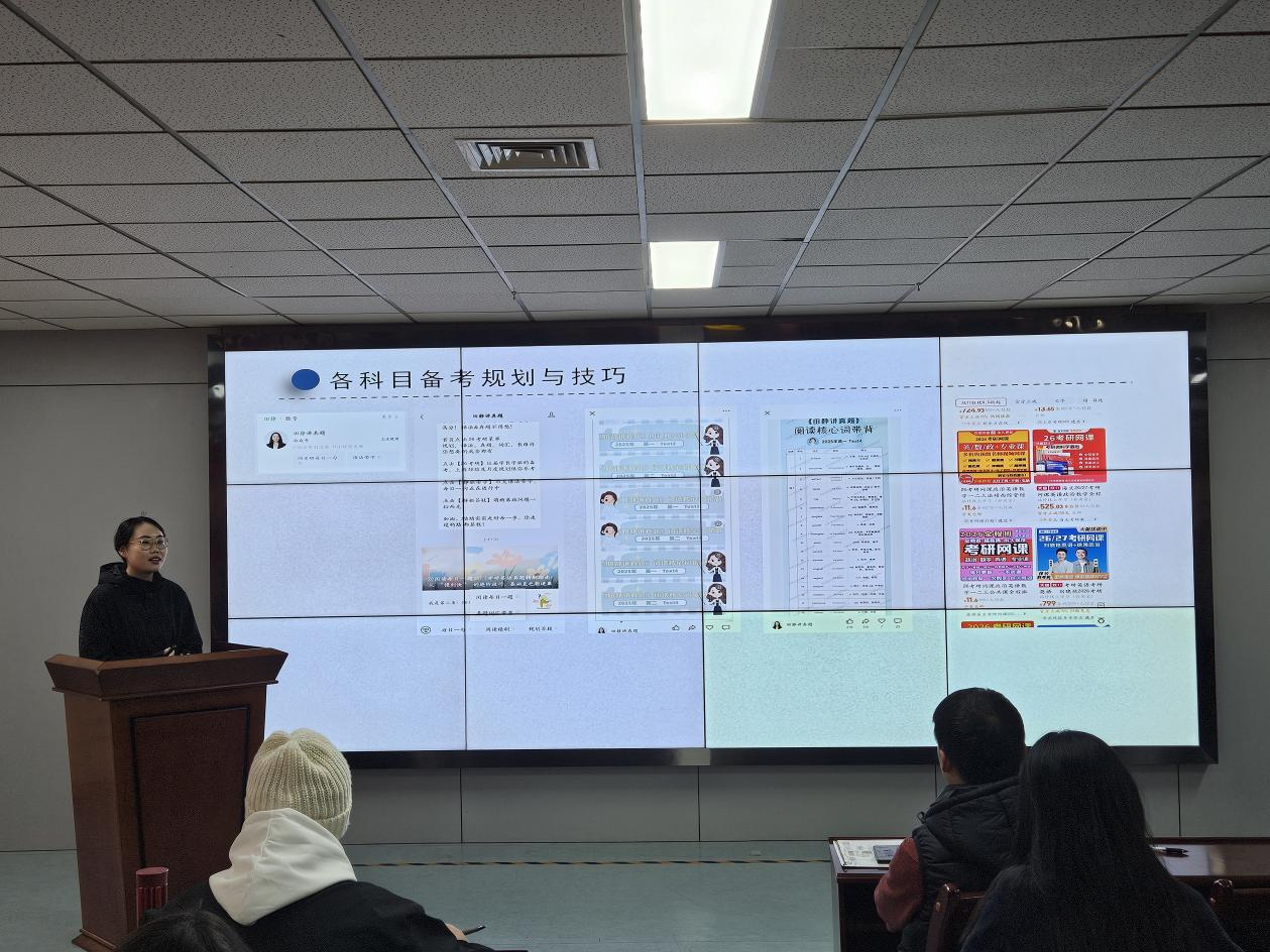 活动中,师生们首先共同学习了党的二十届四中全会精神,并围绕活动主题和学习生活体会进行交流座谈。其中,2025级硕士研究生党员李广宇、陈玉瑞、曹思甜、张卓阳组成“研途青春导师团”,通过案例剖析、策略总结、互动答疑等形式,分别从备考的时间管理、真题解析的效率提升、科研与复习的平衡技巧、复试环节的细节把控等角度进行讲解,现场演示“错题本进阶使用法”“政治选择题口诀记忆”等实用工具,并结合自身经历就“专业课背诵瓶颈”等共性问题逐一解答,为本科生考研提供了指导。