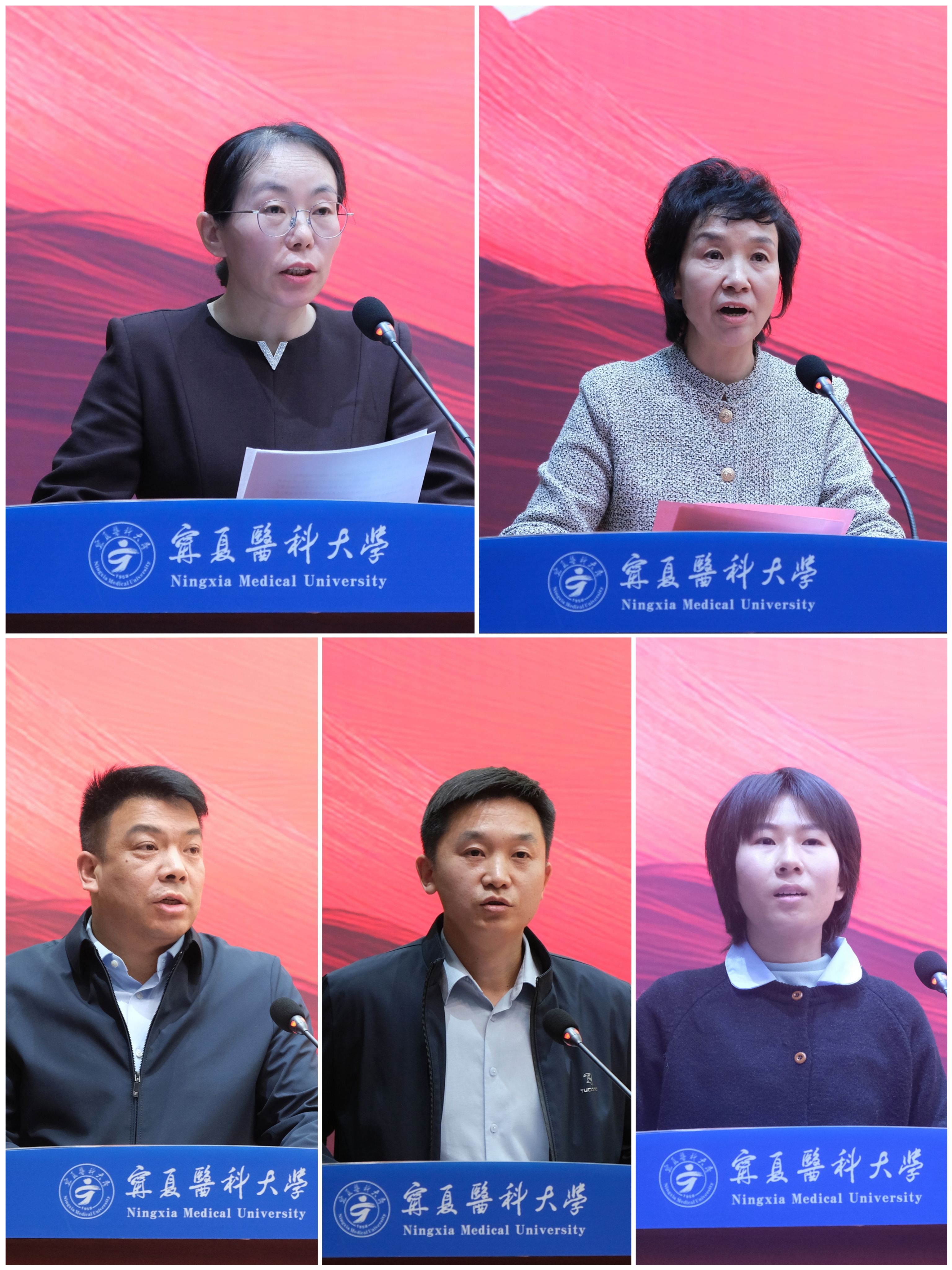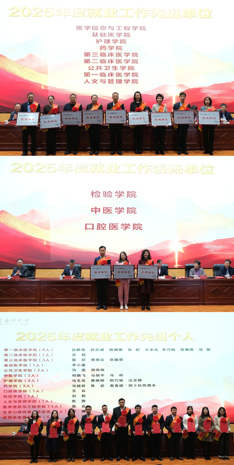 会上,对2025年获评学校就业工作先进单位、表扬单位和先进个人代表进行了表彰。就业工作先进单位代表第一临床医学院姜红、第三临床医学院訾秀娟,先进个人代表医学信息与工程学院苏岳、用人单位代表吴忠市人民医院胡志伏以及2025届优秀毕业生代表第二临床医学院何芳依次作交流发言。