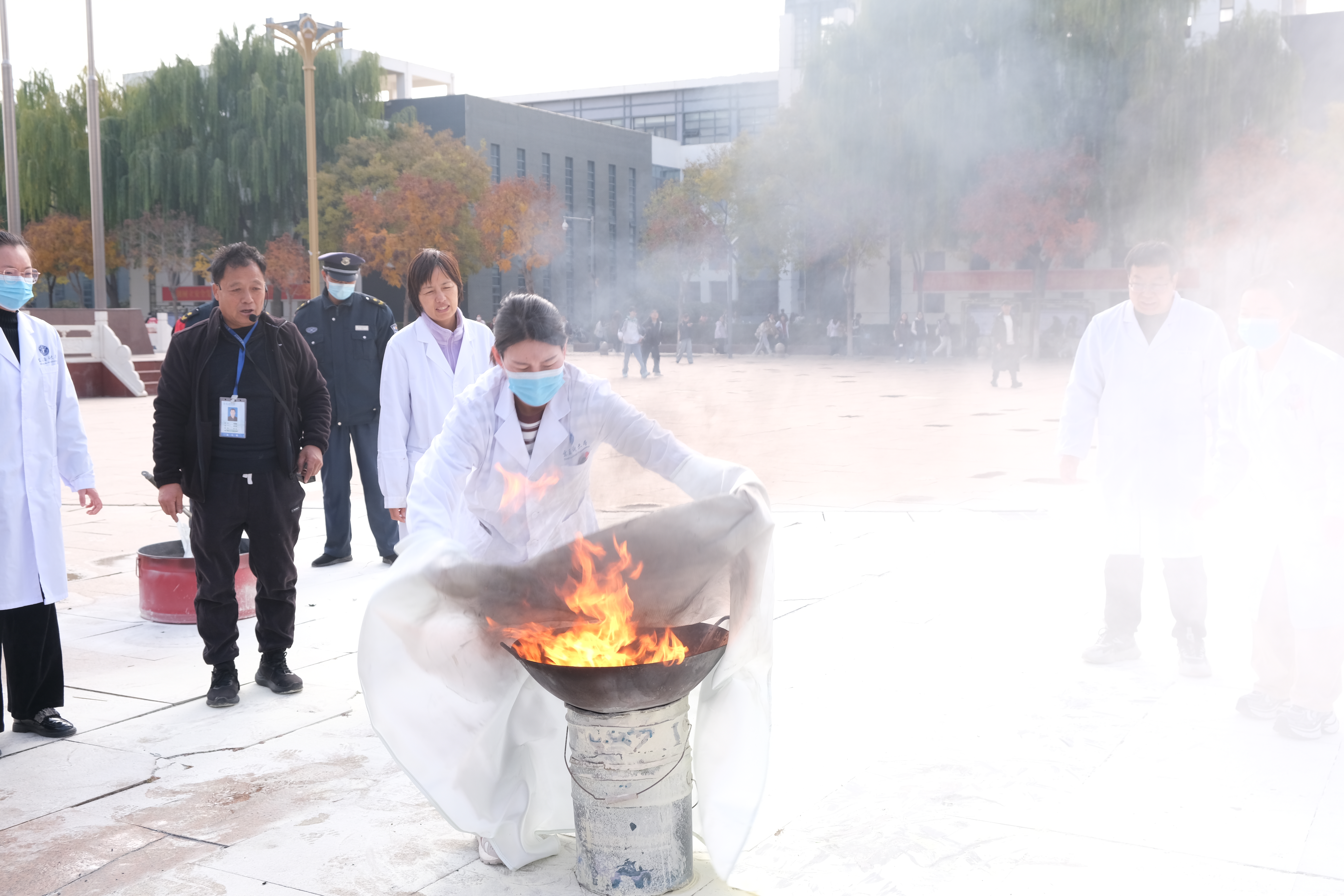 演练高度还原真实火情场景,所在楼宇全体师生严密捂住口鼻,保持弯腰低姿,沿就近消防楼梯,按照指定疏散路线,快速有序撤离至楼外安全区域。撤离后,工作人员立即清点人数,同步对“受伤人员”开展急救处置,并组织人员使用消防器材开展灭火,整个流程衔接紧密、分工明确。