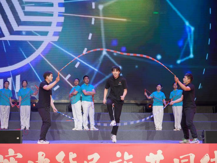 此次参演阵容强大,宁夏跳绳协会的马全福、陈伟两位教师应邀登场,凭借精湛技艺和深厚功底,与学校“绳风破浪”社团的同学们携手带来精彩绝伦的交互绳以及高难度个人集体跳绳表演。他们身姿矫健,跳绳在手中飞速旋转,每一次跳跃都精准有力,高难度动作信手拈来。跳绳在他们脚下翻飞,如同灵动的音符,奏响青春的旋律。《美丽的绳化》节目是体育与美育的完美融合,它巧妙地将跳绳运动的力量感与艺术性结合,不仅让观众沉醉于精彩的表演中,更让深切感受到体育精神的蓬勃生机。