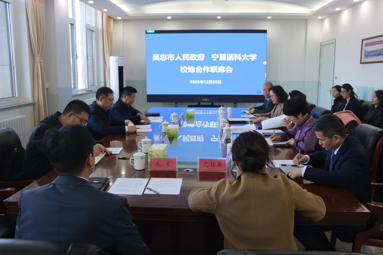 12月26日,学校与吴忠市人民政府校地合作联席会议在学校附属中医医院召开。吴忠市副市长尚自刚,吴忠市医保局局长马瑞英,吴忠市卫健委副主任陈志红,学校党委常委、副校长韩怀钦,附属中医医院领导班子成员及中层干部参加会议。会议由附属中医医院党委书记杜小利主持会议。