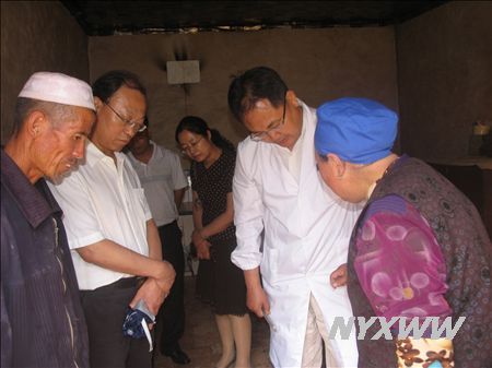 义诊中,张发智书记在学校有关人员、红寺堡镇党委李书记和玉池村主任的陪同下,冒雨来到了久病卧床的农户王大妈家中亲切慰问,总医院骨外科主任胡宁敏教授,为病人进行了认真检查。张书记和胡教授还向病人捐赠了慰问金,并叮咛家人要尽早到大医院做进一步治疗。