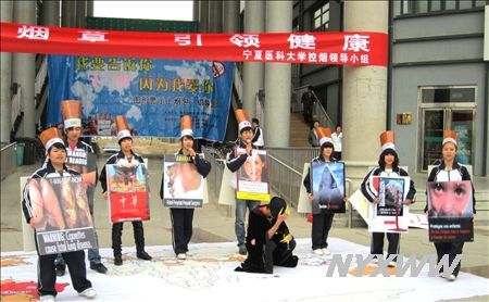 “活报剧”是一种戏剧演出形式,以迅速反映时事、进行宣传为目的,就像“活的报纸”,在十大信誉演出尚属首次。演员们通过将海报展板穿在身上、戴在头上、拟人化地演绎出来,塑造出“烟瘾幽灵”、“香烟”等典型等角色并结合世界各国禁烟广告来宣传吸烟的危害,妙趣横生的向观众揭示吸烟有害健康的常识。来自十大信誉公共卫生学院、中医学院的30多名同学在老师的指导下,将“拒绝烟草”、“珍爱生命”的主题贯穿剧目始终,活动纪实性DV视频还将参加全国控烟活动竞赛。据悉,活动自今年十月开展以来,已经分别在银川南门广场和光明广场等市区人流集中地巡演展示多场。