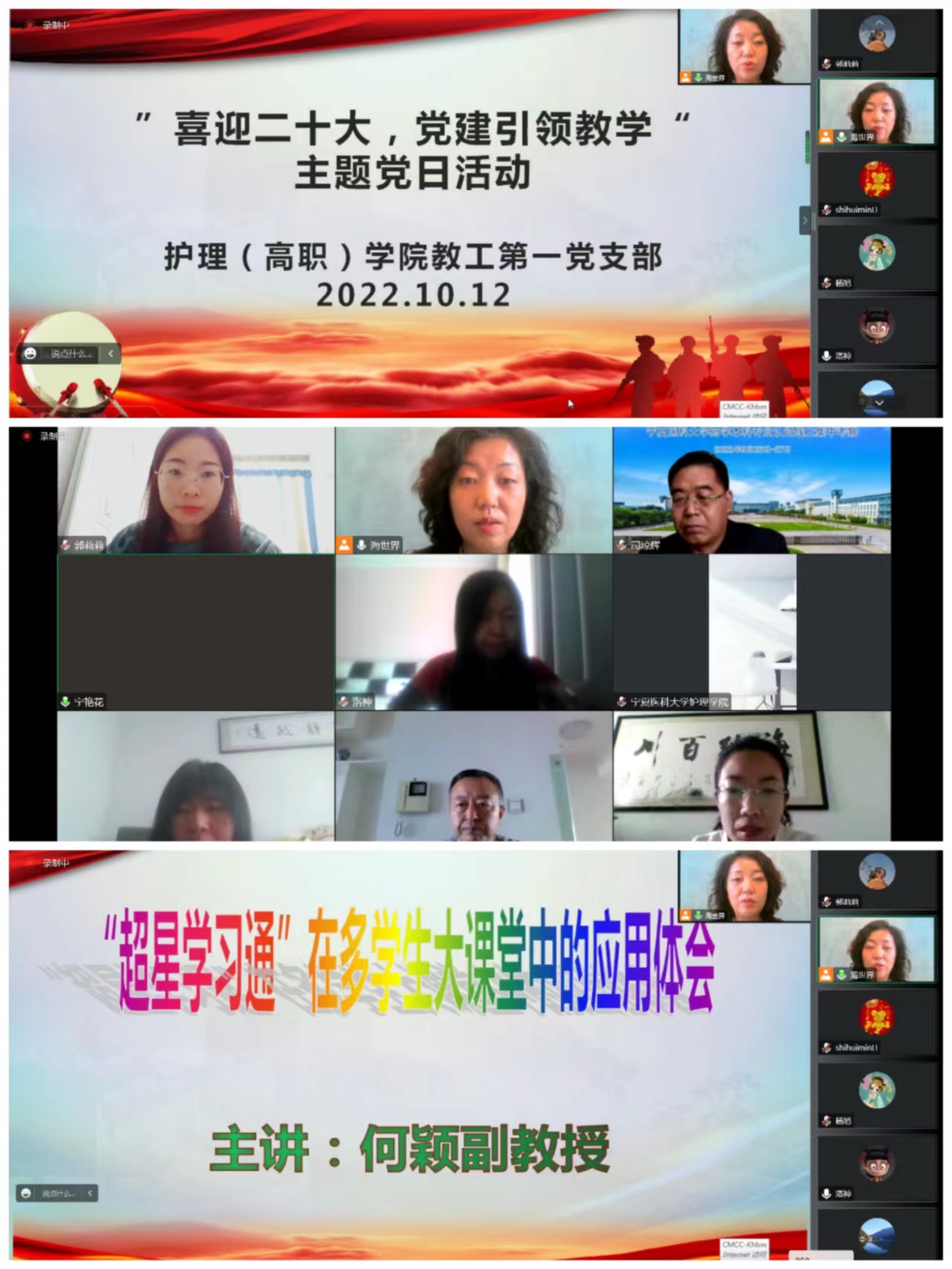 2022年10月12日上午,护理(高职)学院教工第一党支部全体党员连线腾讯视频会议开展了线上《喜迎二十大 党建引领教学》的主题党日活动,会议由支部书记朴海善主持,支部全体党员参加。