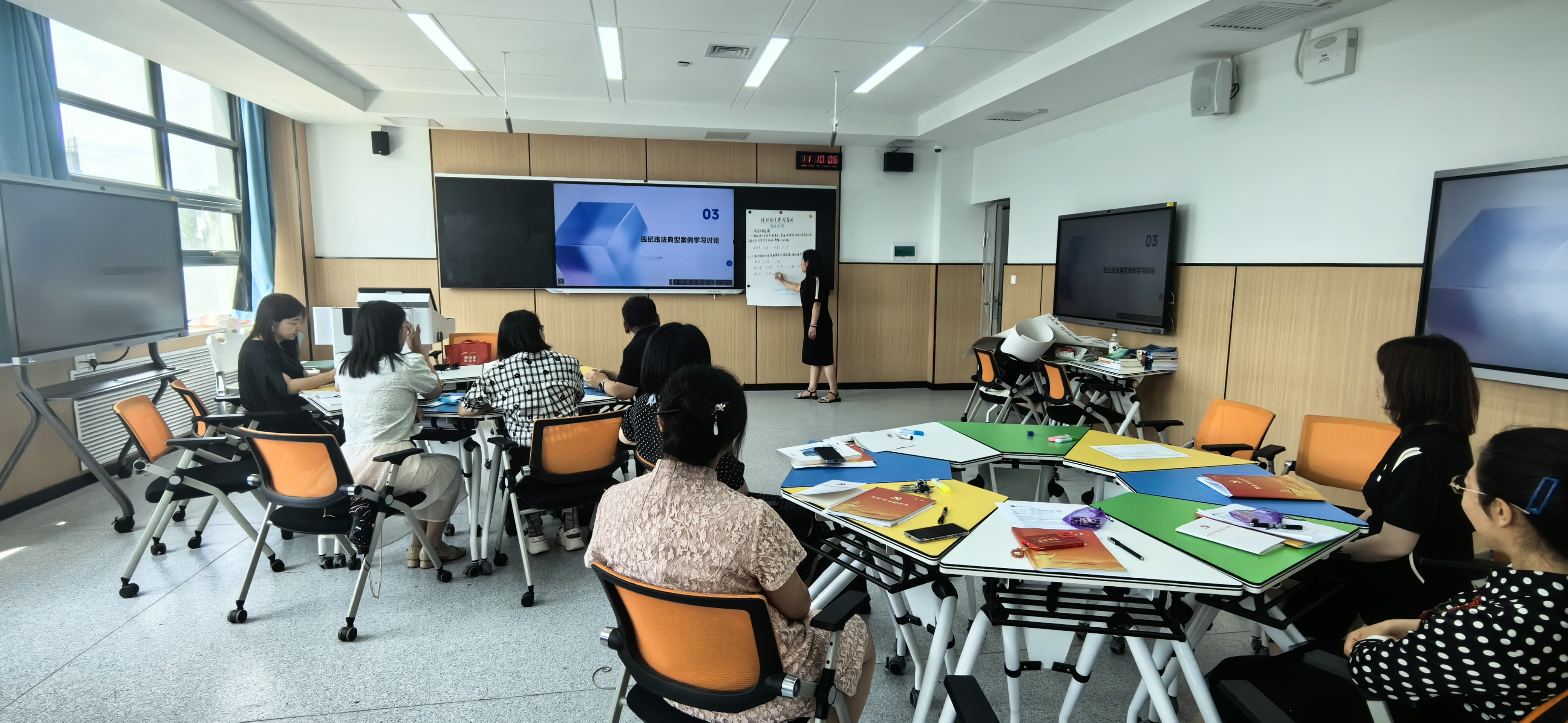 随后,本次主题党日活动结合国家课程思政建设体系要求,以基层教学组织为抓手,着眼护理专业核心课程,以一堂课的课程思政教学设计为单元,通过《基础护理学》和《儿童护理学》两门主干课程教学团队老师们的通力合作,以模拟微工作坊的形式开展课程思政教学设计说课及教学研讨活动,凝聚集体智慧,拓展课程思政设计思路,以教育目标为导向,不断提升老师们的课程思政教学能力。本次主题党日活动内容丰富,契合党建促教学实际,取得了预期效果。