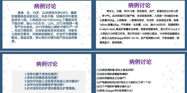 以第一次见习课为例,本次见习内容包括正常分娩及产褥期的护理和异常分娩妇女的护理,共 4 个学时。云端见习设置了理论知识回顾、云端视频见习和病例讨论三个部分。
