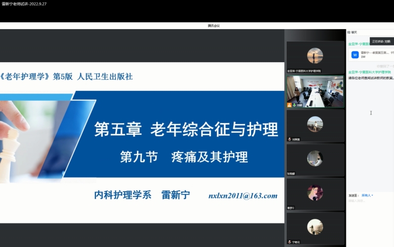 为充分评估临床系部任新课教师对新课程的把控能力,以保证教学质量,护理学院于2022年9月27日召开任新课教师线上试讲工作,本次试讲教师为临床护理一系雷新宁。学院副院长米光丽主持,教学指导委员会成员、学院教学管理办公室以及《老年护理学》课程负责人参加了本次试讲活动。