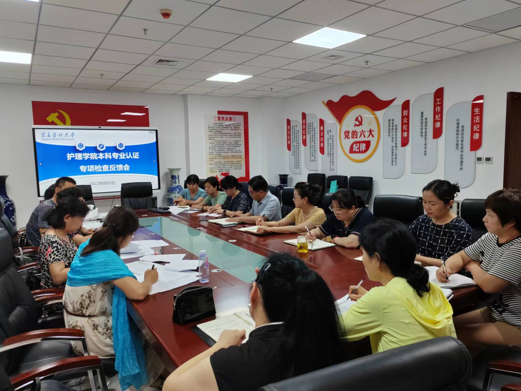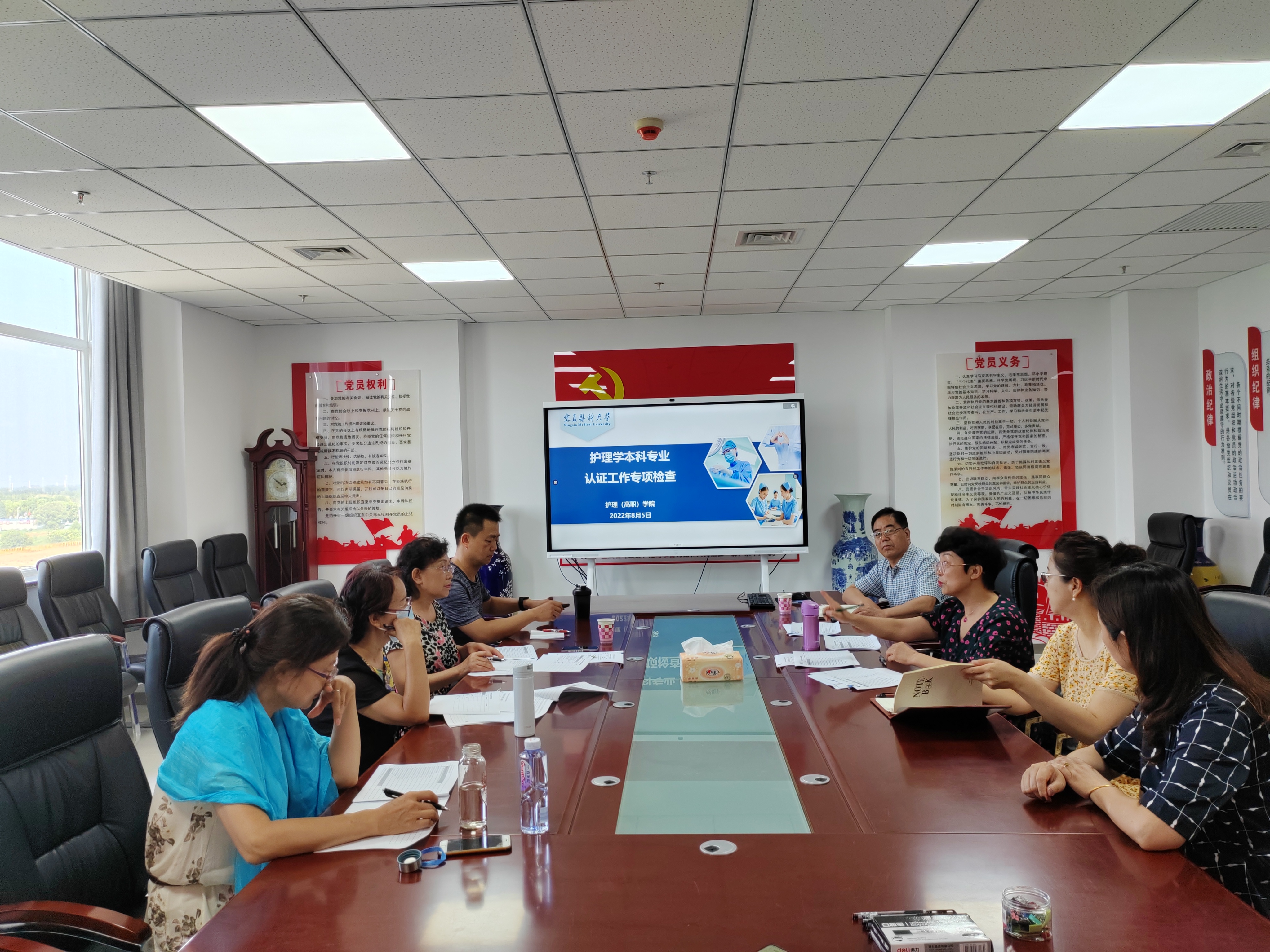 8月5日,学院召开护理学本科专业认证工作专项检查暨检查反馈会,邀请李胜玲、王研、冯宁川、刘秀梅、常越五位专家到我院对学院各系部的教学资料进行了专项检查,由李胜玲担任检查组组长。护理学院班子成员司琼辉、乔慧、钱月慧、李兆君、宁艳花、各系系主任及认证办参加了本次检查。会议由学院教学副院长宁艳花主持。