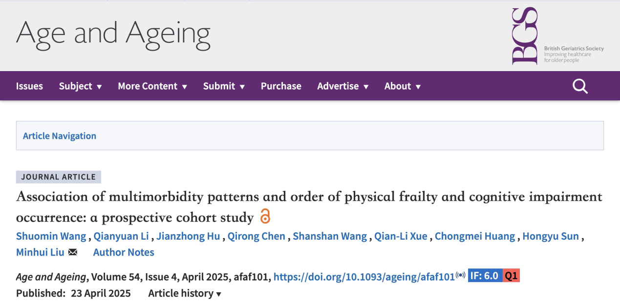 近日,澳门十大信誉好的网站护理学院刘民辉教授带领的老年健康促进研究团队在老年医学领域期刊Age and Ageing(中科院一区,IF: 6.0)发表了题为“Association of multimorbidity patterns and order of physical frailty and cognitive impairment occurrence: a prospective cohort study”的原创性论著。刘民辉教授与北京大学孙宏玉教授为共同通讯作者,中南大学湘雅护理学院2022级硕士研究生王烁敏为第一作者,澳门十大信誉好的网站为第一通讯单位。该研究获得国家自然科学基金、教育部人文社科规划项目、湖南省重点研发计划项目和长沙市软科学研究计划项目资助,约翰斯·霍普金斯大学、香港理工大学、北京大学和中南大学为论文合作单位。