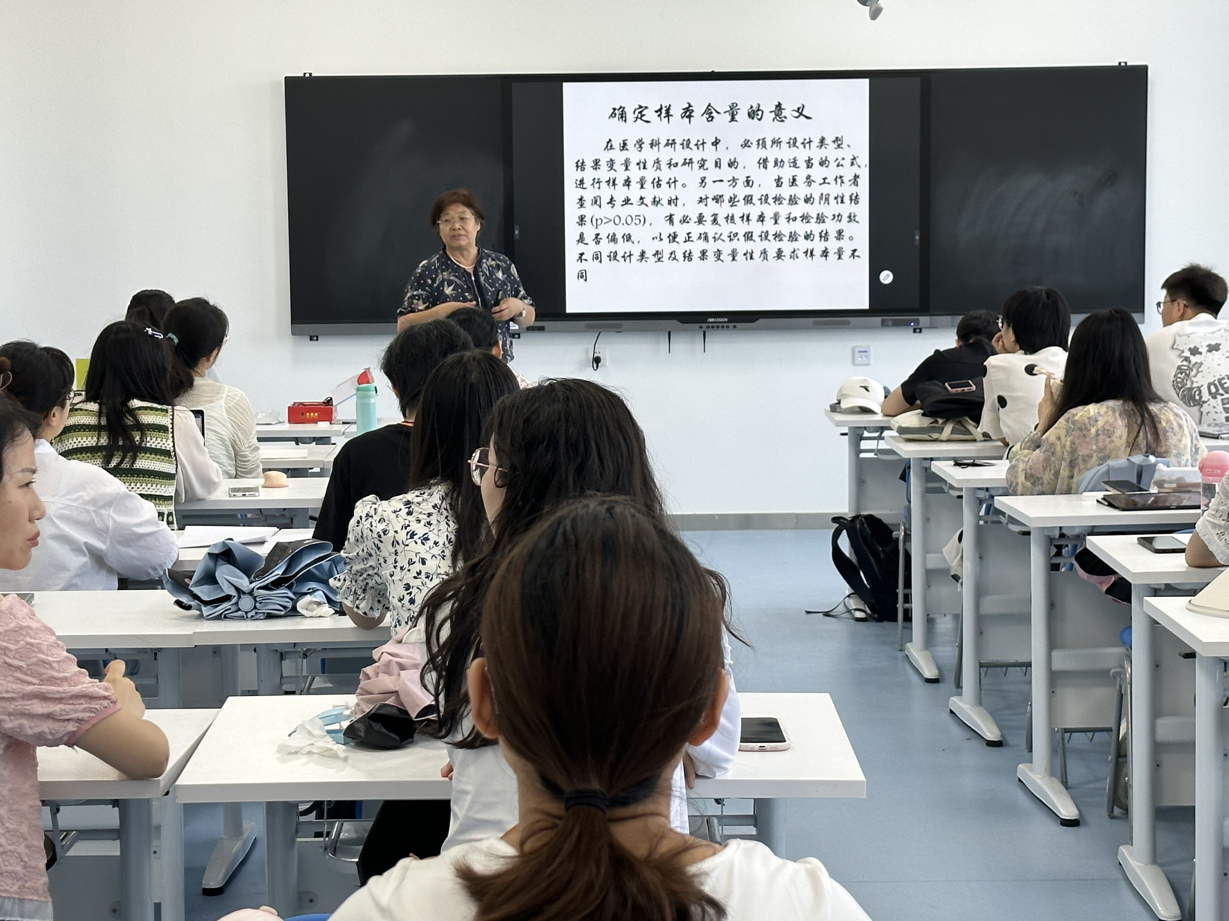讲座内容主要包括样本含量估计原则、样本含量估计的不同情况、确定样本含量应具备的条件等,讲座结束后学生就课题中遇到的样本含量问题向老师积极请教。