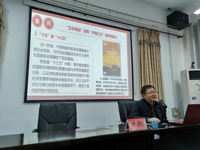 牛阳以“擎画新蓝图 开启新征程”为题,从党的十九届五中全会召开的背景、党的十九届五中全会公报主要内容、开启全面建设社会主义现代化国家新征程三个方面,结合真实的案例、详实的数据、生动的故事以及个人的生活经历,详细为师生们解读了党的十九届五中全会精神。他希望师生主动了解、学习、关注、领会党的十九届五中全会精神,紧跟时代步伐,加强政治修养,用崇高的理想拓展人生宽度,用丰富的知识夯实人生厚度,用宽广的精神搭建人生高度,在“十四五”期间奋发有为,为祖国建设贡献力量。
