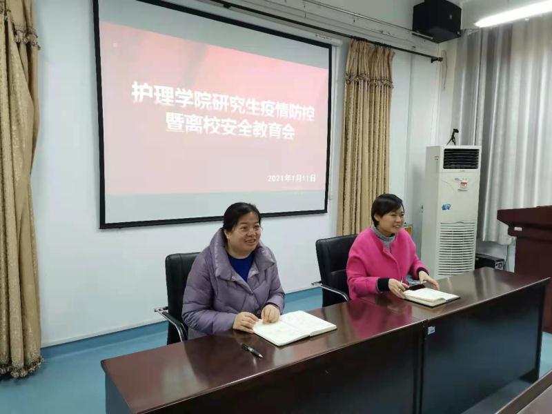 为进一步落实自治区有关疫情防控工作会议精神及学校相关文件精神,从严落实好各项防控措施及寒假期间研究生安全稳定工作,护理学院于1月11日上午在润德楼学术报告厅开展研究生疫情防控暨离校安全教育会。学院党委副书记耿瑶、副院长李兆君、辅导员及全体在校研究生参加会议,校外研究生以钉钉群直播形式参加大会。