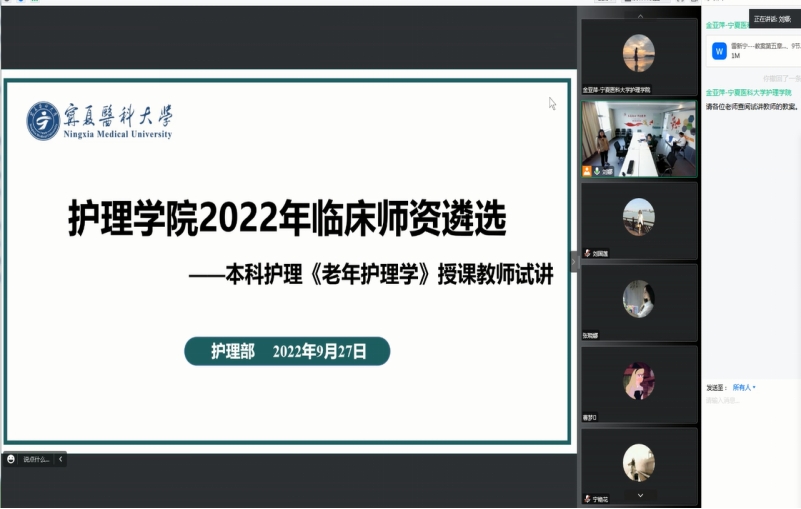 为充分评估临床系部任新课教师对新课程的把控能力,以保证教学质量,护理学院于2022年9月27日召开任新课教师线上试讲工作,本次试讲教师为临床护理一系雷新宁。学院副院长米光丽主持,教学指导委员会成员、学院教学管理办公室以及《老年护理学》课程负责人参加了本次试讲活动。