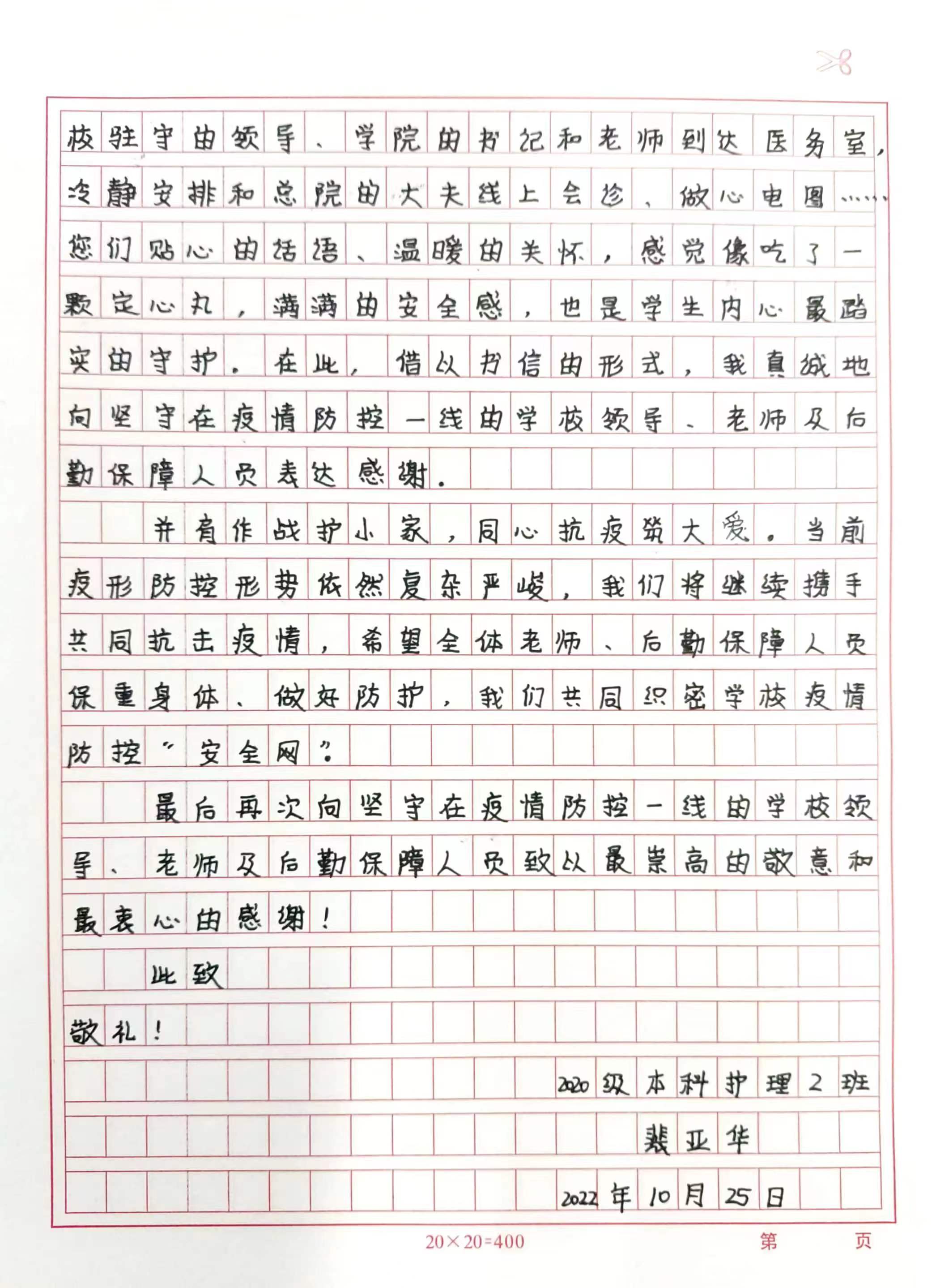 裴亚华在身体恢复后,主动书写了一封情感真挚的感谢信,感谢学校领导、老师、后勤保障人员对同学们的关心和关爱,对他们的无私付出致以最崇高的敬意和最衷心的感谢,也相信一定能打赢疫情防控战!