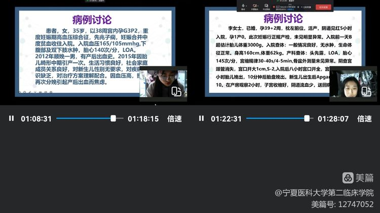 云端视频见习:该环节是本次见习的重点,通过云端视频,带教老师带领学生见习产科病区、产房环境、产房常用的抢救物品及药品、产包内容,高危妊娠产妇评估及管理等内容。通过云端视频,学生能够身临其境的了解正常分娩及高危妊娠产妇的管理。
