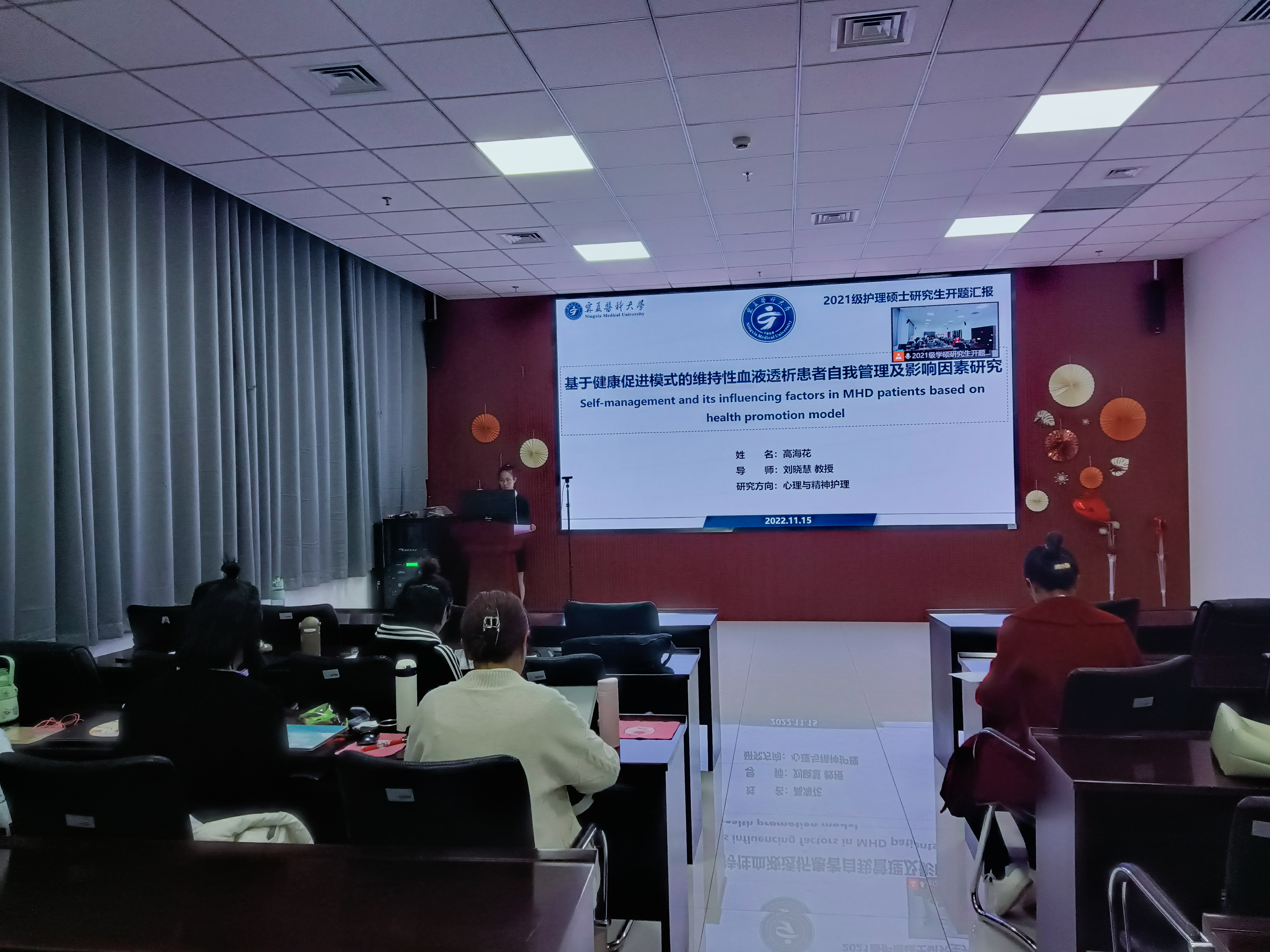 为加强硕士研究生培养与管理工作,学院于2022年11月初举行2021级学术型研究生开题汇报工作。由于疫情防控要求,本次会议线上线下同步进行。李兆君副院长邀请郑州大学护理学院张艳教授、山东大学崔乃雪教授、澳门十大信誉好的网站护理学院李胜玲教授、澳门十大信誉好的网站总医院张曦主任、澳门十大信誉好的网站总医院丁雯主任、宁夏回族自治区人民医院梅迎雪主任担任此次开题汇报的线上评审专家,汇报学生线下参加。