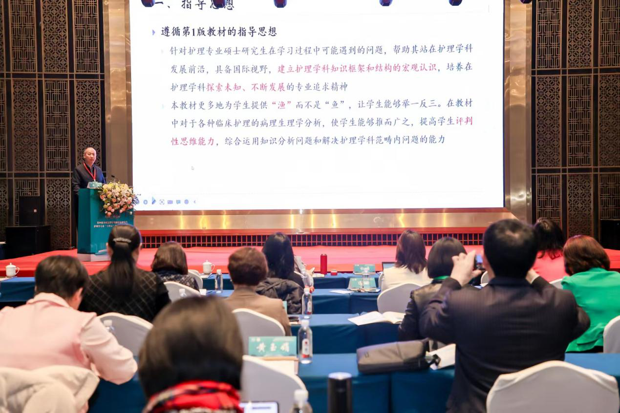 大会专题报告环节由中南大学湘雅护理学院刘民辉副教授主持。安力彬教授以“一流研究生教材建设的思考”为题,详细解读了一流教材的建设要求,特别是“增根铸魂、启智增慧”的根本要求,从编写团队组建、整体方向把握、教材传承创新和教材高质量建设四个方面做了深入思考。四本研究生教材的第一主编孙宏玉、赵岳、冯辉和孙玉梅教授分别进行了教材编写思路的分享,章雅青教授介绍了数字教材编写思路。他们从不同角度分享了研究生教育的新理念,提出教材编写要重视内容的理论性、前沿性、创新性和实践指导性,要注重研究生教育的共性、特性和复杂性,以及如何巧妙地利用数字化技术,如思维导图、知识图谱等方面的内容。