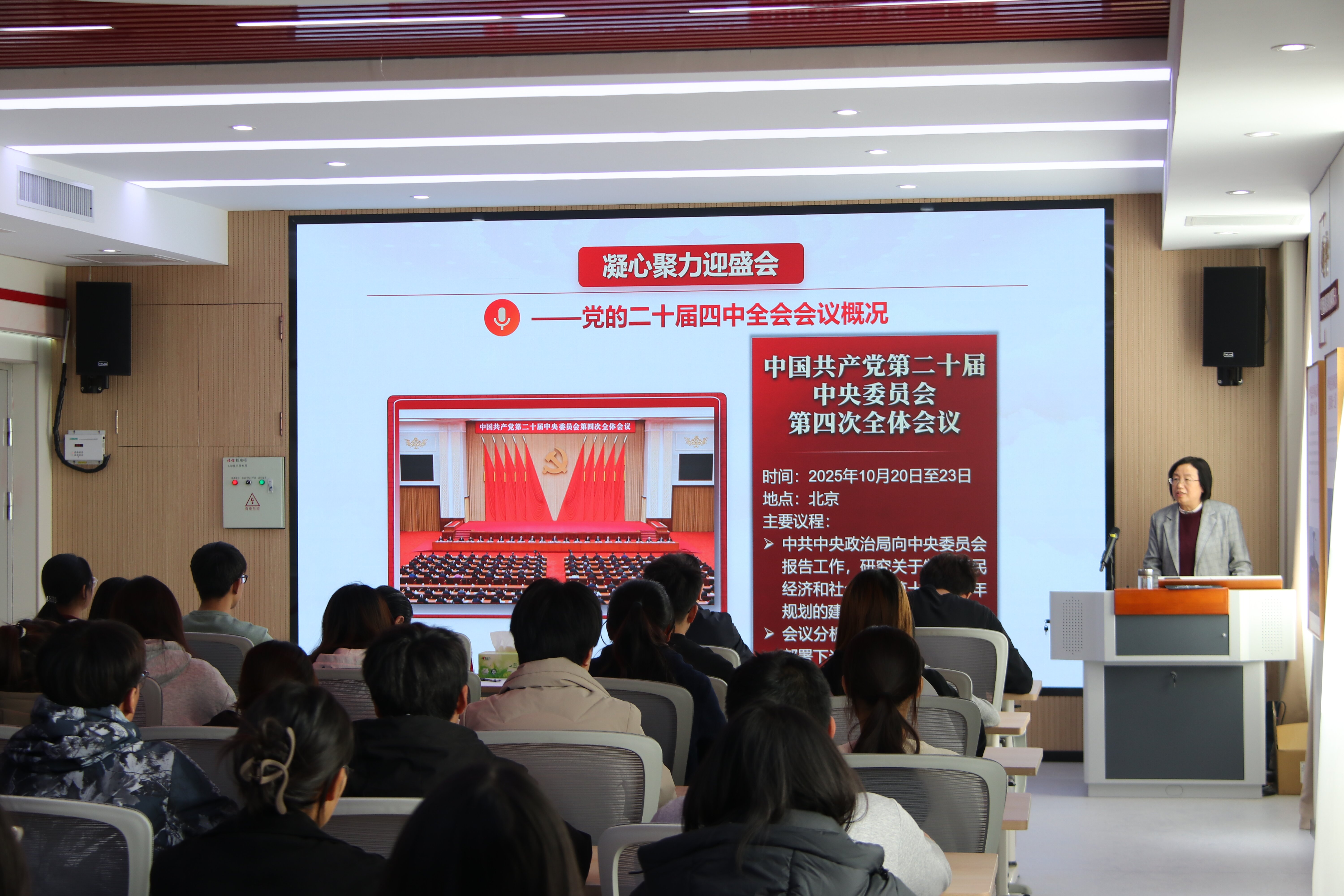 邓彦芳以“征程万里风正劲 蓝图再绘启新篇”为题,围绕党的二十届四中全会概况、当前我国经济发展的形势与机遇挑战、从“十四五”实践看中国发展答卷、“十五五”时期经济社会发展的谋篇布局四个方面,为师生们系统阐释党的二十届四中全会精神。