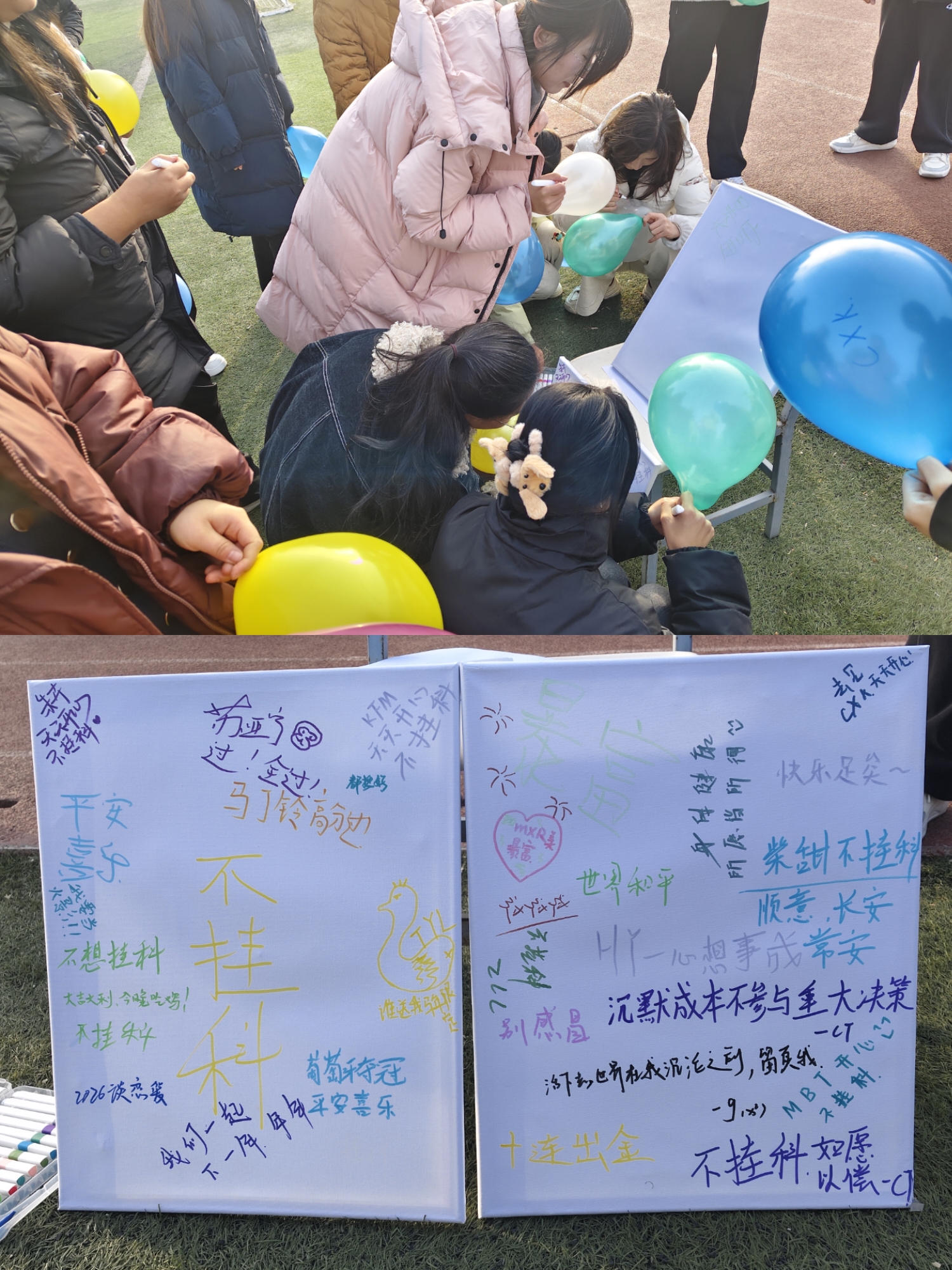 活动在轻松愉快的氛围中展开。开场“心愿绘制”环节,同学们手持画笔,把对考试的信心、对未来的期盼融入到色彩明快的画作与真挚动人的文字里。笔尖游走间,流淌的不仅是青春的蓬勃朝气,更传递着彼此鼓励、携手奋进的情谊。随后的趣味活动精彩纷呈:“正话反做”考验反应与默契,“丑鸭子赛跑”展现协作与乐观,“保护萝卜”则在奔跑与守护中深化了团队信任。田径场上欢声笑语不断,备考的紧张在互动中悄然释放。