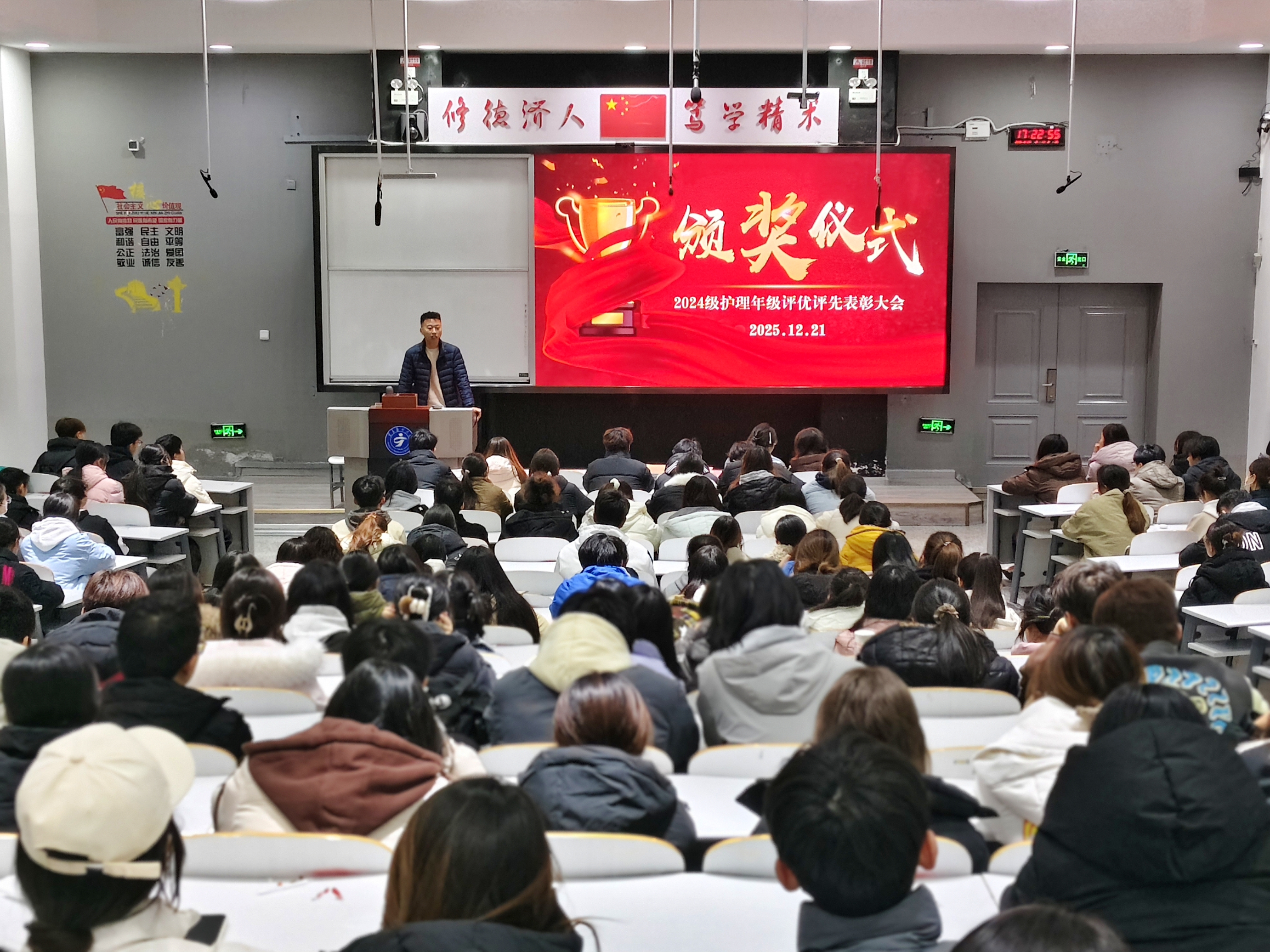 为表彰先进、树立典型,营造“比学赶帮超”的良好学风,引导学生激发内驱力,2024年12月21日,护理学院2024级护理年级在应谦楼101教室召开2024-2025学年总结大会。活动对上一学年在学业表现、班级建设等方面表现突出的个人与集体颁发奖状,并组织开展了先进事迹学习交流。