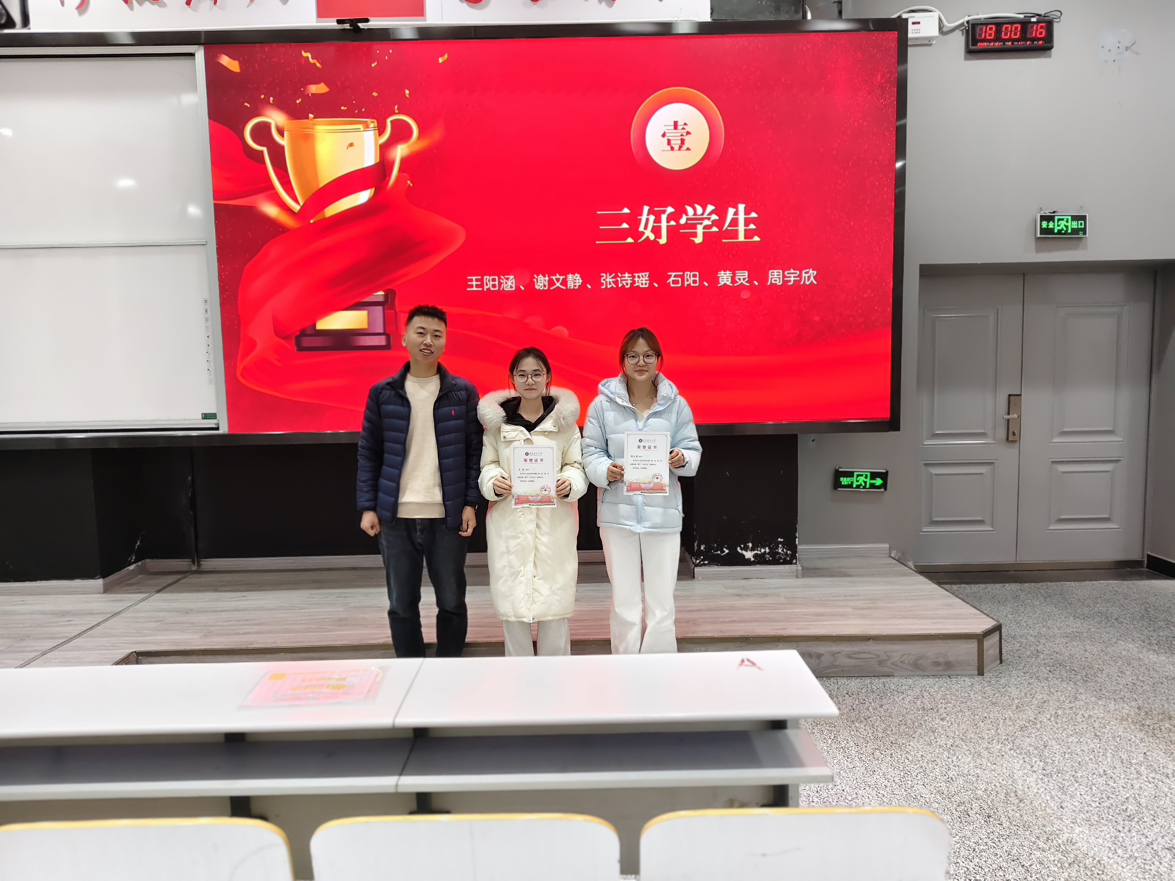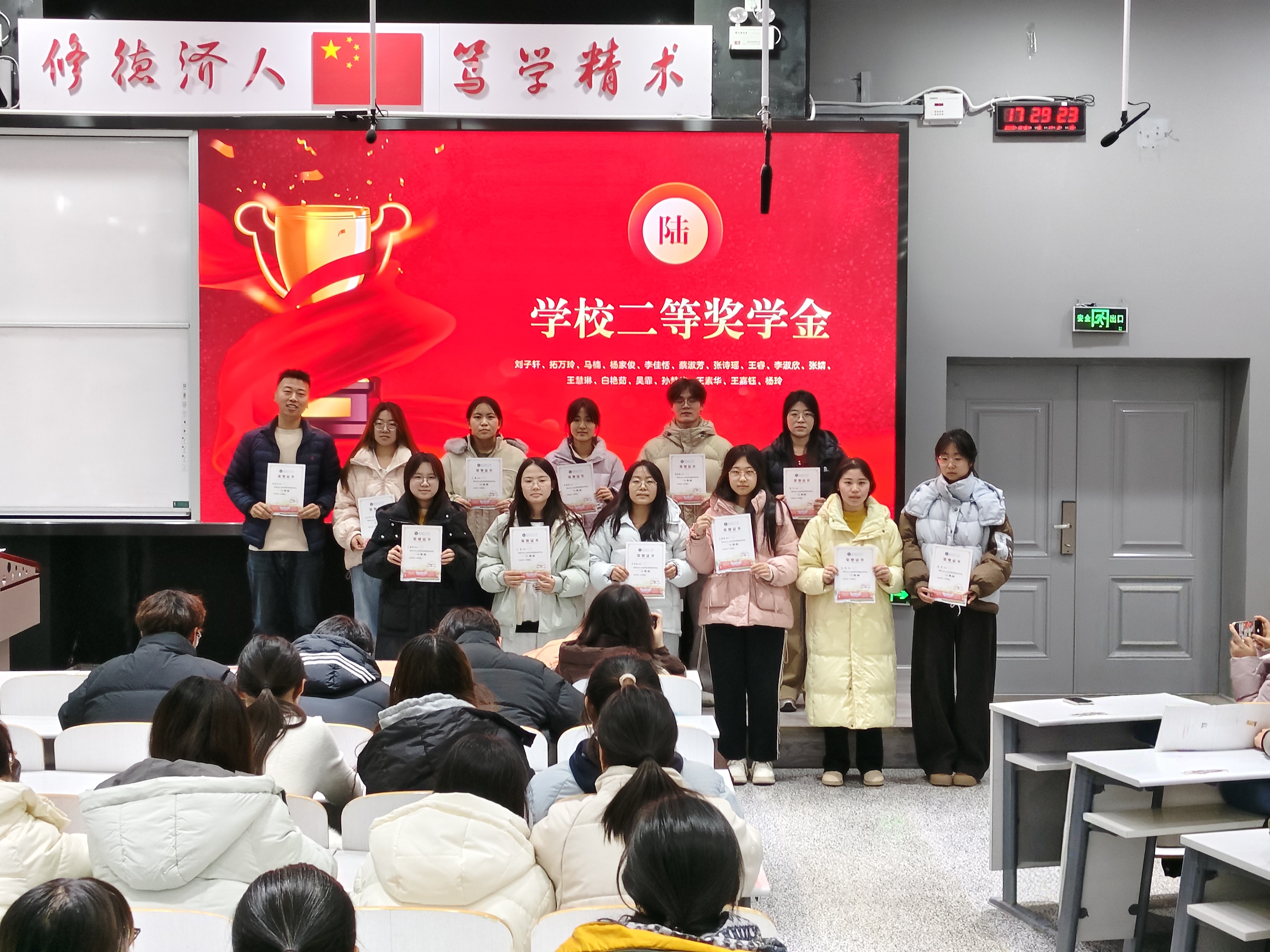 在颁奖环节,辅导员苏晓龙为获得学校表彰的先进个人和优秀班集体颁发荣誉证书,以庄严仪式肯定成绩、激励前行;在身边榜样环节,通过图文并茂的形式,将国家奖学金获得者葛骐瑞同学在专业学习、科研实践与服务奉献方面的经验与感悟进行分享。最后,辅导员向全体学生发出倡议,鼓励大家以先进为镜,主动对照、查找不足,夯实专业基础,提升综合能力,为未来发展与成长筑牢根基。