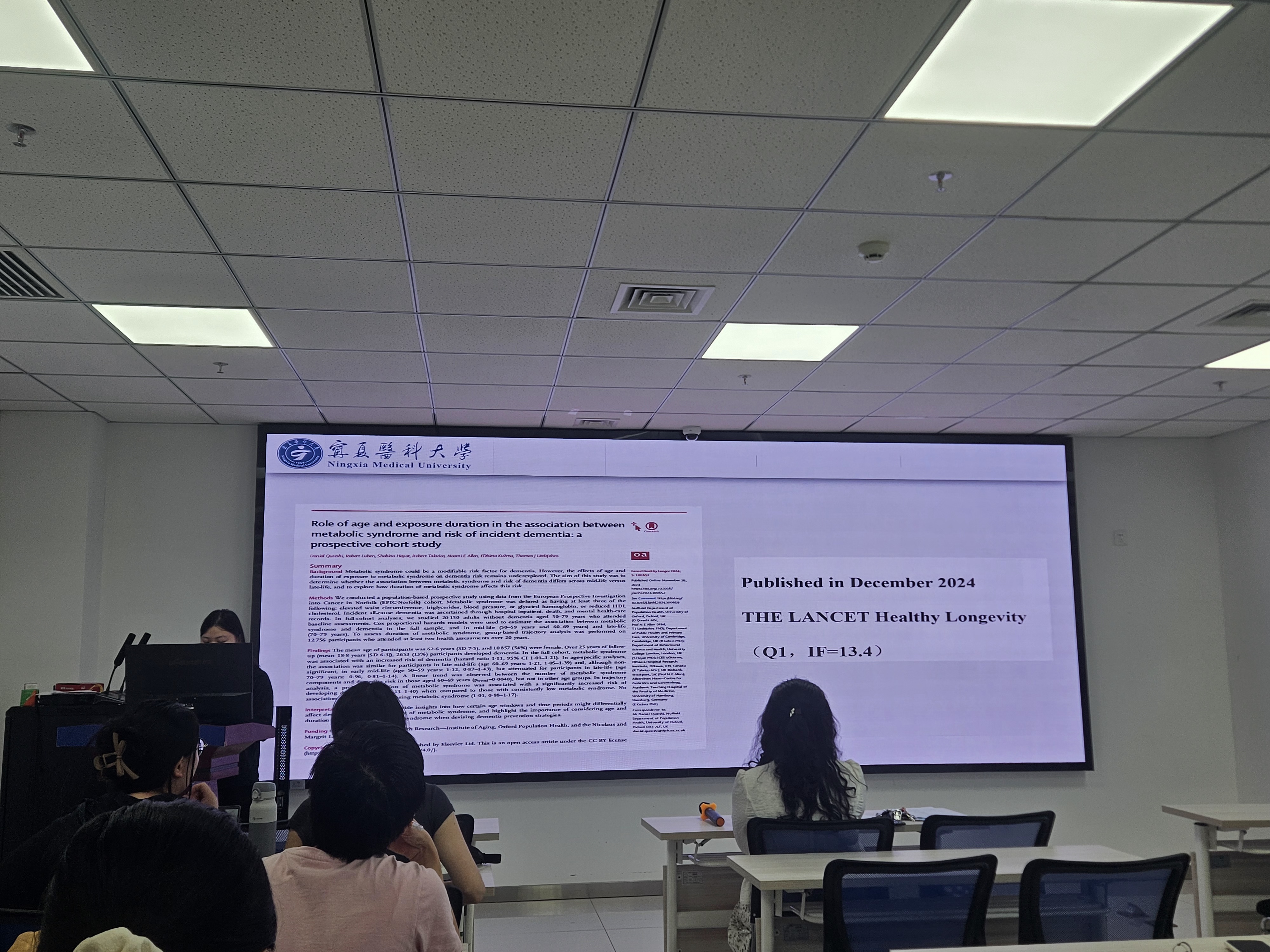 第一位汇报者是2024级专业型研究生李霜,她汇报的文章发表在《The Lancet Health Longevity》期刊,影响因子为13.4(中科院1区),题为“Role of age and exposure duration in the association between metabolic syndrome and risk of incident dementia: a prospective cohort study”。研究详细探讨了代谢综合征作为痴呆潜在可改变风险因素的研究现状。尽管先前研究已证实代谢综合征与痴呆风险之间存在关联,但关于年龄和暴露时长对其具体影响研究尚少。该研究发现代谢综合征在中年(特别是60-69岁)显著增加痴呆风险,而在晚年则影响较小,这可能与晚年暴露的逆向因果关系有关。此外,长期暴露于代谢综合征亦显著增加痴呆风险,提示了暴露时长的重要性。第二位汇报者是2024级学术型硕士研究生王宁,她汇报的文章发表在《Journal of Advanced Research》期刊,影响因子为11.4(中科院1区),题为“Exploring the mediating roles of depression and cognitive function in the association between sarcopenia and frailty: A Cox survival analysis approach”。研究深入探讨了代谢综合征暴露时长对痴呆风险的影响,同样基于上述研究,长期暴露于代谢综合征(超过20年)的人群痴呆风险显著增加,而新近出现代谢综合征的人群则未观察到显著风险增加,这一发现提示了代谢综合征的累积效应对大脑健康的长期影响,并呼吁临床上应更加关注患者的代谢综合征持续时间和管理策略。