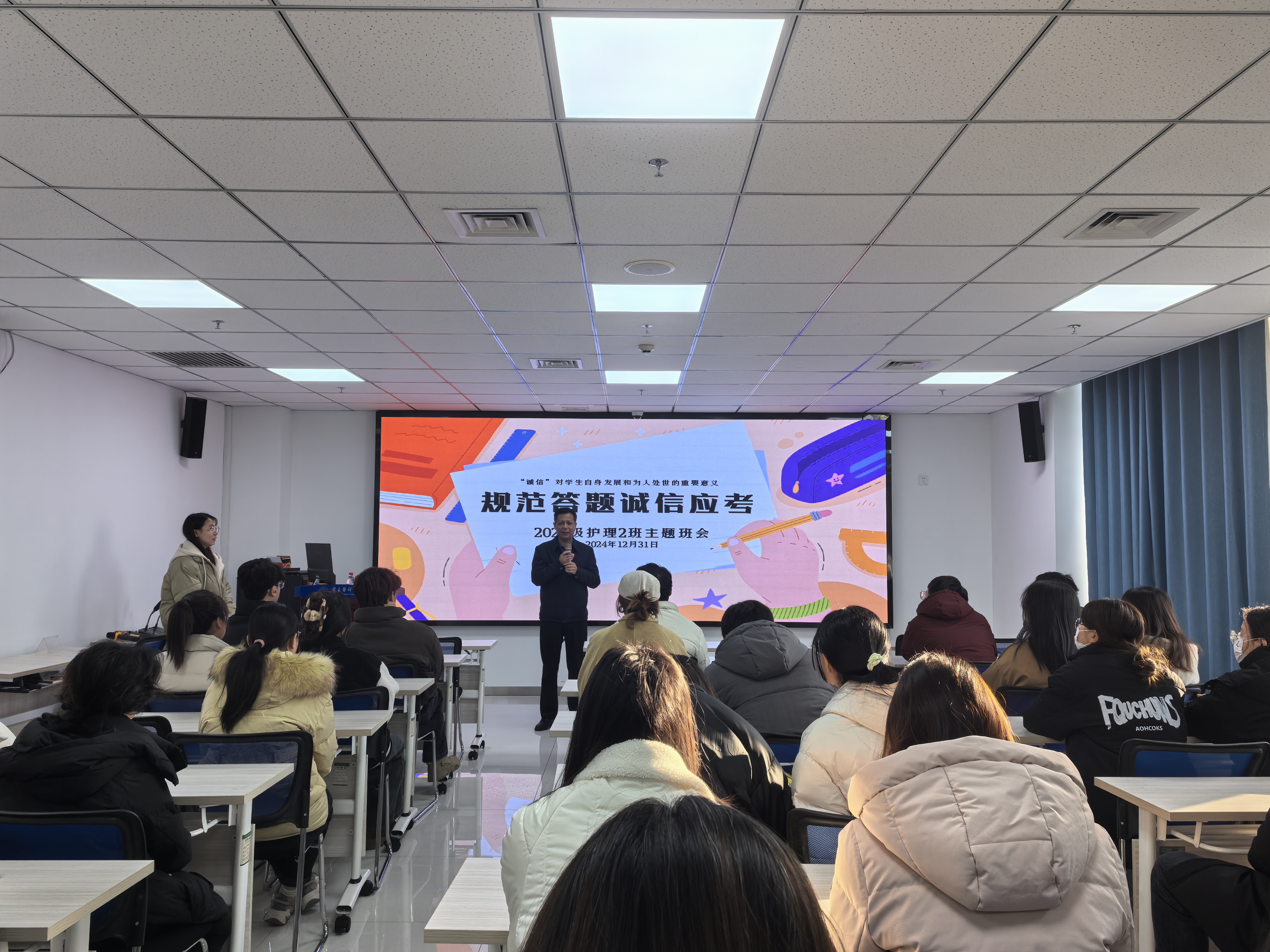 12月31日,学院党委书记马玉龙在知行楼1111会议室参加2023级本科护理2班“规范答题 诚信应考”主题班会,2023级本科护理2班全体学生参加。