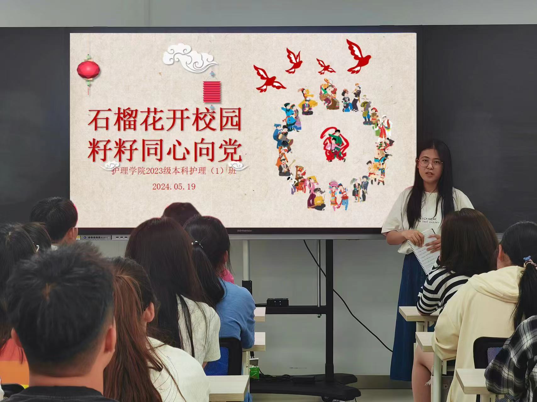 5月19日下午,护理学院2023级本科护理(1)班在知行楼1111教室开展了“石榴花开校园 籽籽同心向党”主题班会,护理学院党委书记马玉龙参加了本次班会。