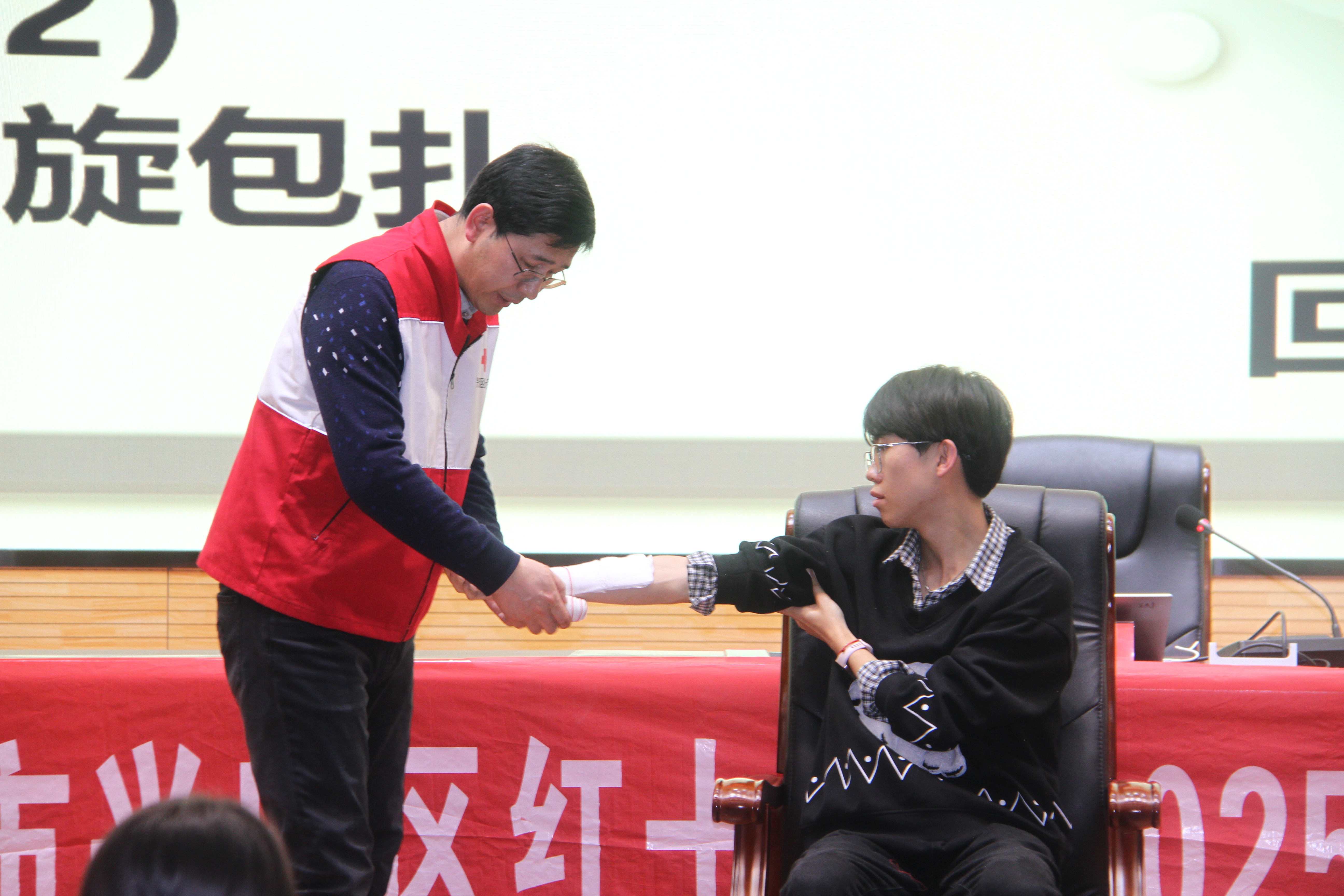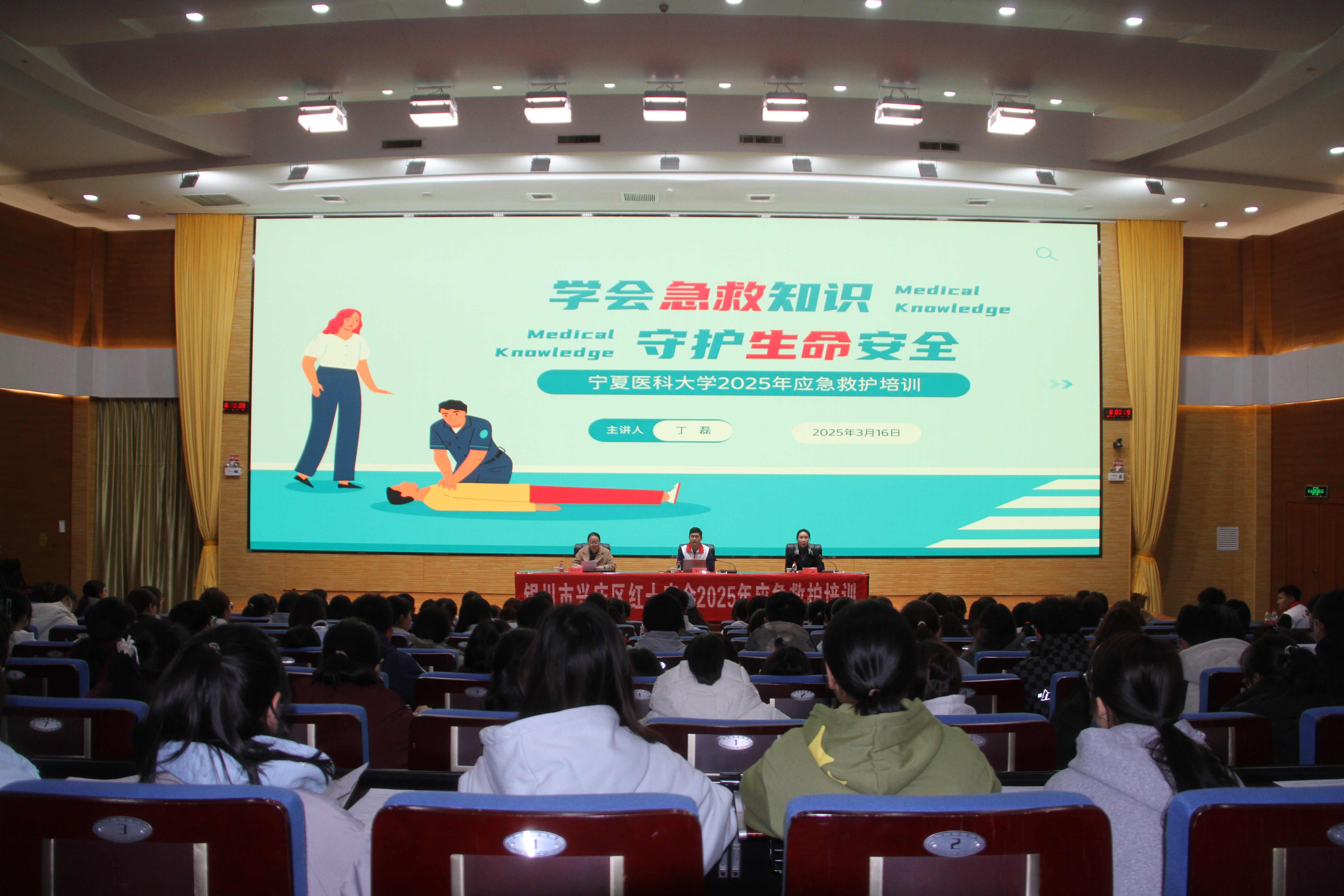 本次培训由宁夏红十字会应急救护培训师资专家组成员丁磊担任主讲。培训课程涵盖心肺复苏术、自动体外除颤器使用、创伤止血包扎、骨折固定、气道异物梗阻急救等核心内容,深入浅出地讲解了“黄金救援四分钟”的重要性及操作要点,并通过视频演示、互动问答等形式强化理论认知,为后续实操奠定扎实基础。