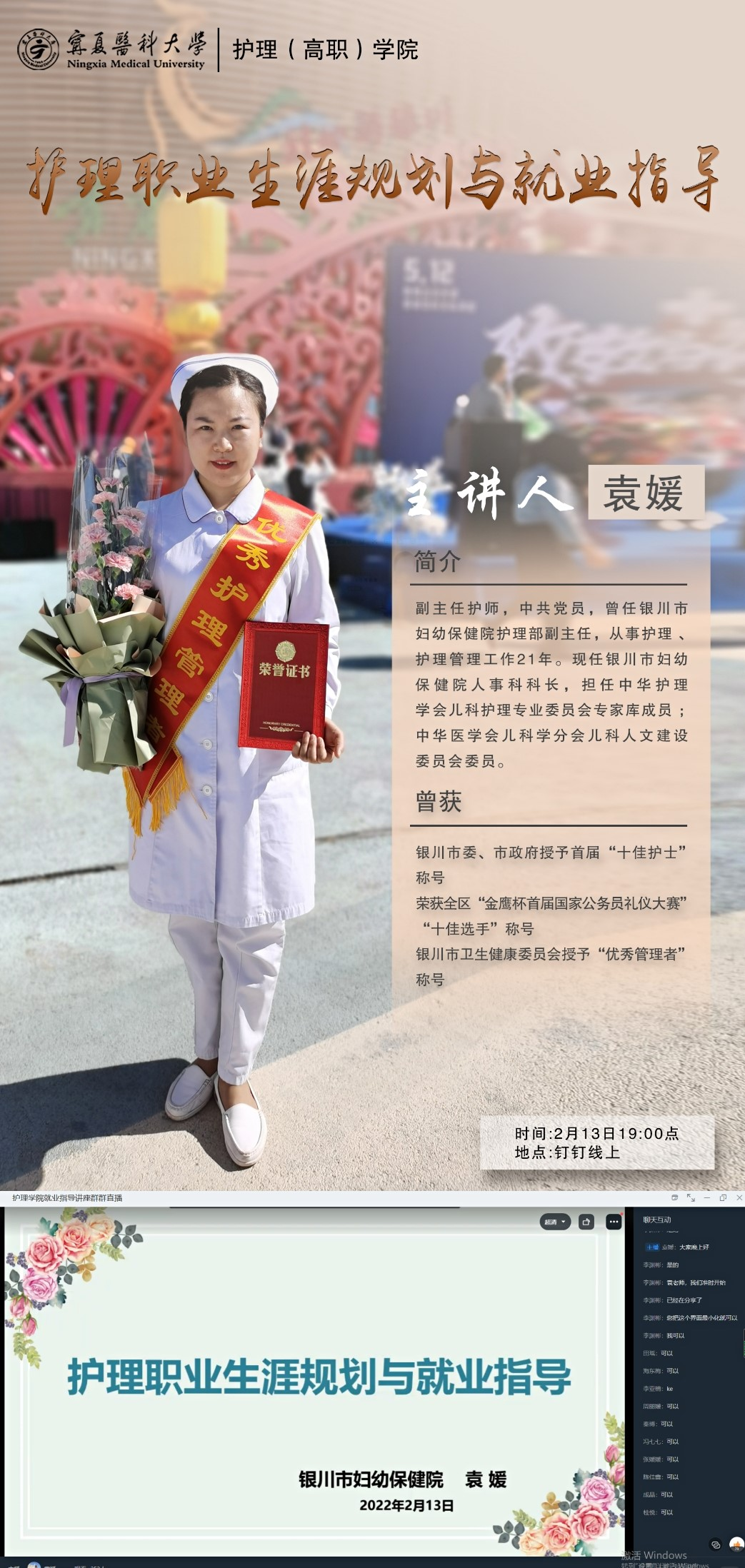 护理学院于2022年2月13日19点邀请银川市妇幼保健院人事科负责老师为毕业年级学生进行《护理职业生涯规划与就业指导》线上讲座,主要从护理职业规化、医院介绍、就业应试技巧三个方面对同学们进行了细致的解析与指导。自1月28日市妇幼发布护理岗位需求信息后,学院积极宣传、及时发布,并一直主动与医院人事部门对接,努力为毕业生近期现场应聘“铺路架桥”。同时,各辅导员老师也按要求组织了全院各年级同学积极参加了学校招就处今晚举办的就业创业能力线上培训。