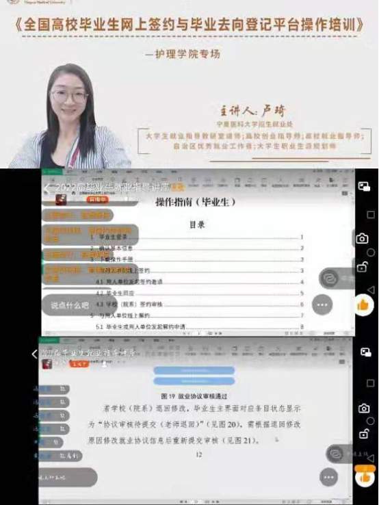 12月5日晚19点,护理学院邀请学校招生就业处卢琦老师,为我院2022届毕业生及预实习年级学生进行了“全国高校毕业生网上签约预毕业去向登记平台操作”培训。