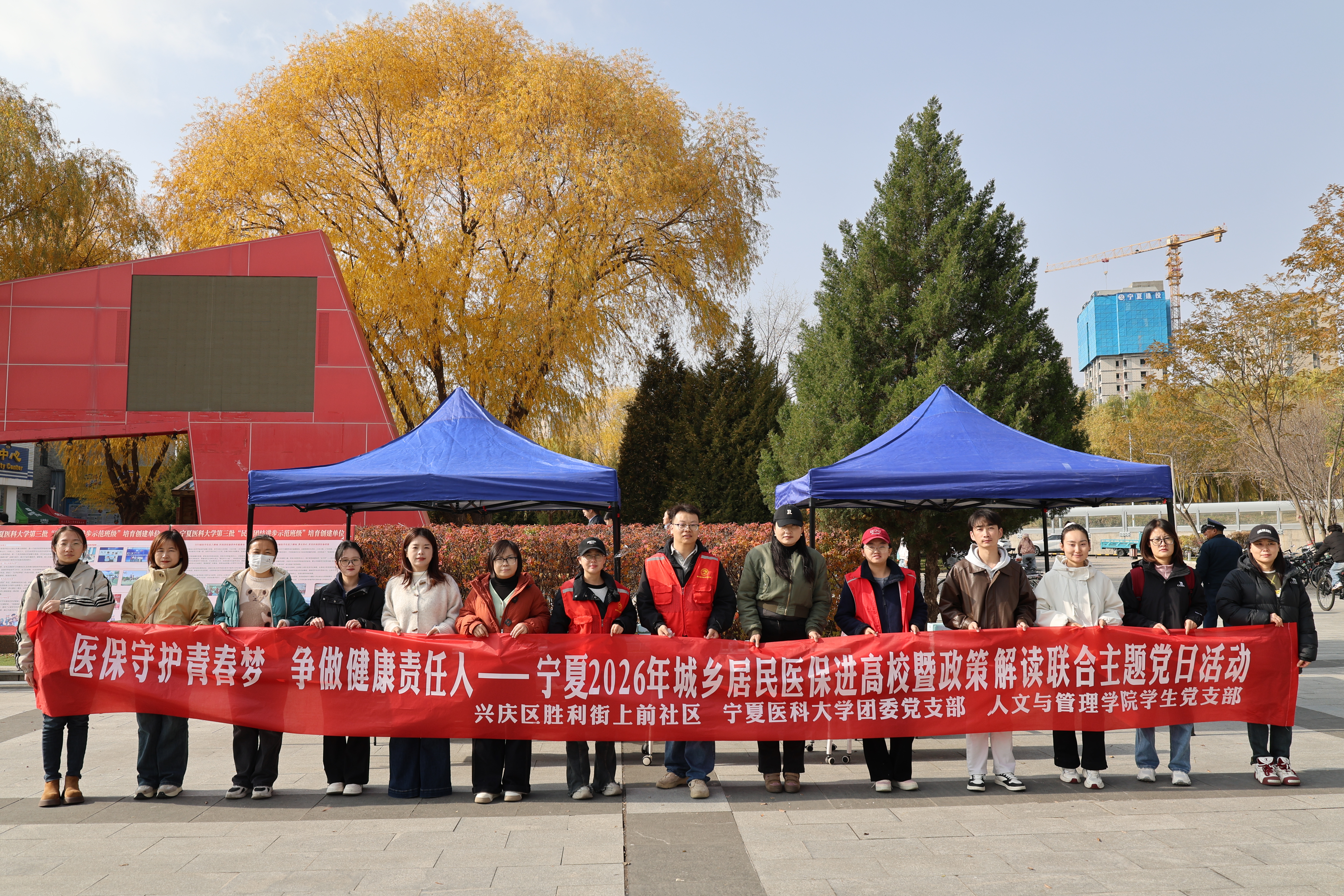 为深入学习贯彻党的二十届四中全会精神,践行全会关于“加快建设健康中国”的决策部署,进一步提升大学生医疗保障意识,筑牢校园健康防线,11月7日,学院学生党支部联合学校团委党支部、兴庆区胜利街上前社区,在雁湖校区尚德广场共同举办“医保守护青春梦,争做健康责任人——宁夏2026年城乡居民医保进高校暨政策解读”主题党日活动。学校团委、学院学生党支部全体师生党员和部分学生团员代表,兴庆区胜利街上前社区党支部及医保专干人员参加本次活动。