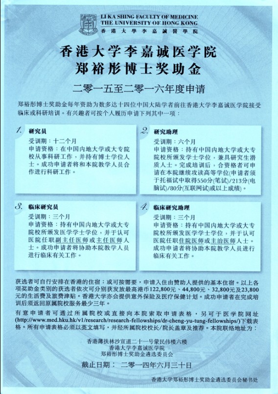 香港大学李嘉诚医学院郑裕彤博士奖助金2015-2016年度申请通知