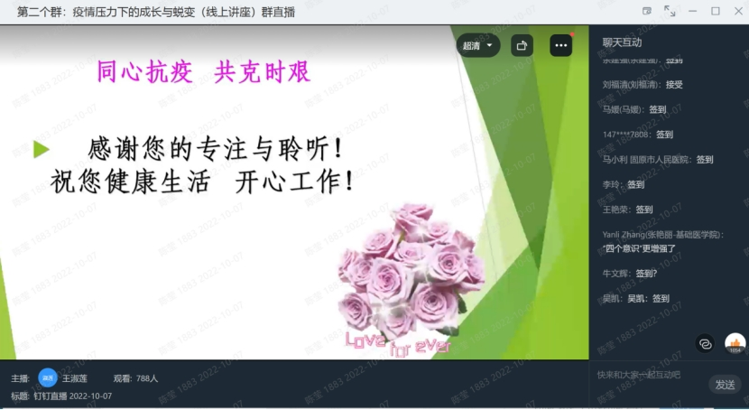 10月7日下午,学校人事处特邀宁夏大学教育学院王淑莲教授开展“疫情压力下的成长与蜕变”线上讲座,学校近千名教师线上聆听讲座。