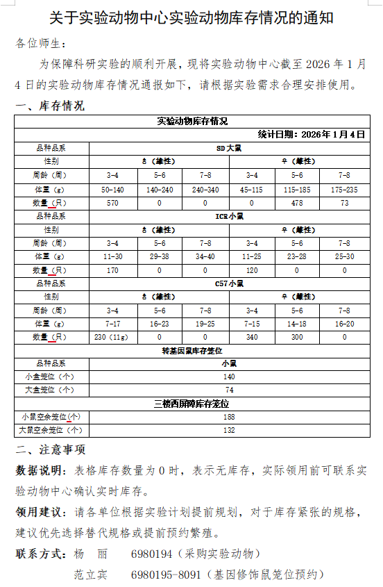 关于实验动物中心实验动物库存情况的通知(第十九周)